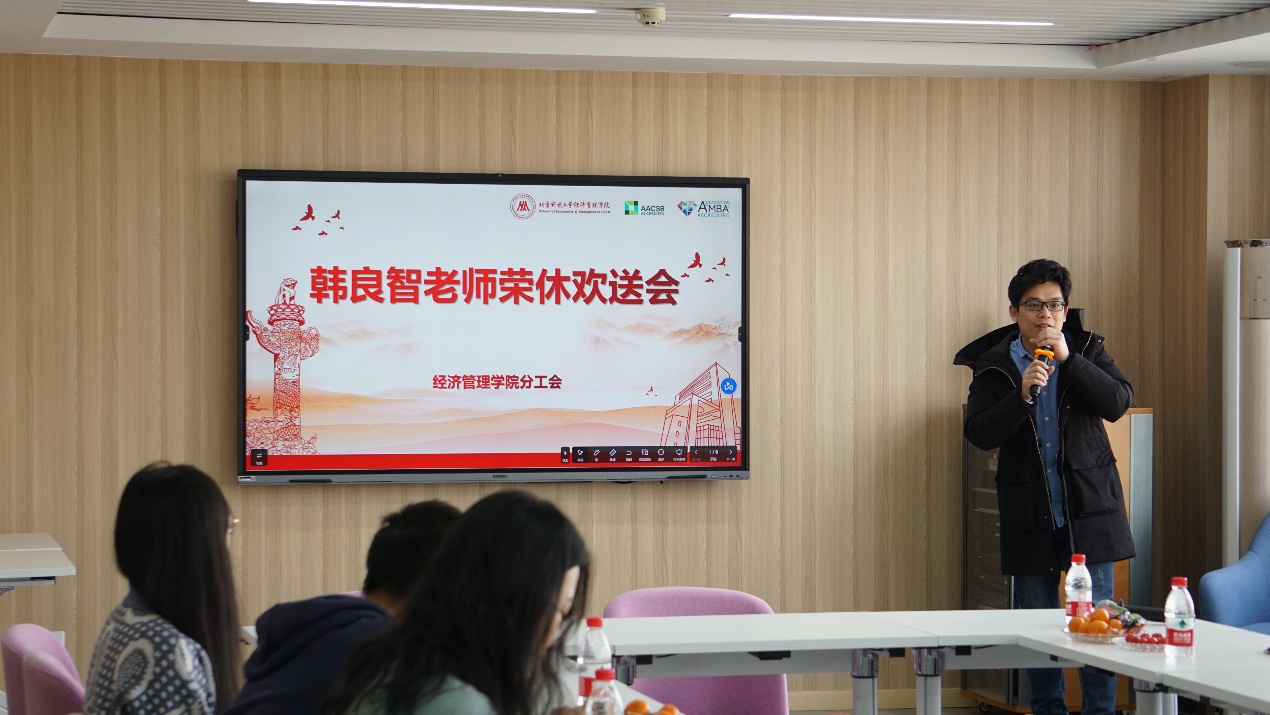 荣休会由91麻豆院办、院分工会和财会系共同筹办,由财会系黄秋彬老师主持,91麻豆领导、教师等30余人齐聚经管楼1205房间,共贺韩老师光荣退休,并送上了诚挚的祝福。
