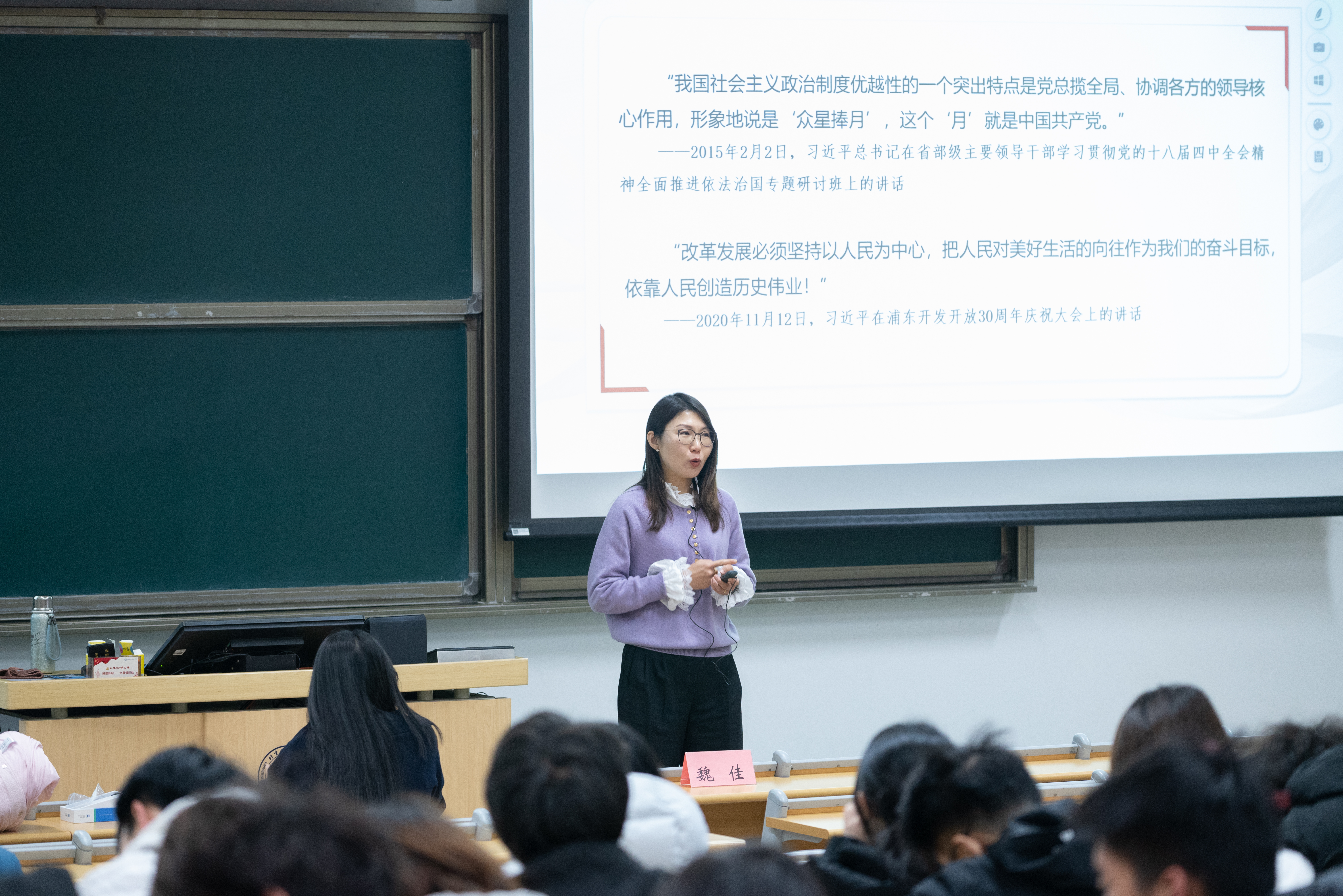 围绕“坚持党的全面领导”,魏佳援引党的十九届六中全会决议,详解“两个确立”的决定性意义与“两个维护”的核心内涵。通过毛泽东同志“桃子的故事”、《没有共产党就没有新中国》创作背景等案例,结 合遵义会议等历史节点,印证党的领导的根本性作用。谈及“坚持以人民为中心”,魏佳结合习近平总书记在浦东开发开放30周年庆祝大会上的论述,指出其核心是“把人民对美好生活的向往作为奋斗目标,依靠人民创造历史伟业”,以脱贫攻坚、民生改善等实例说明理念的实践逻辑。