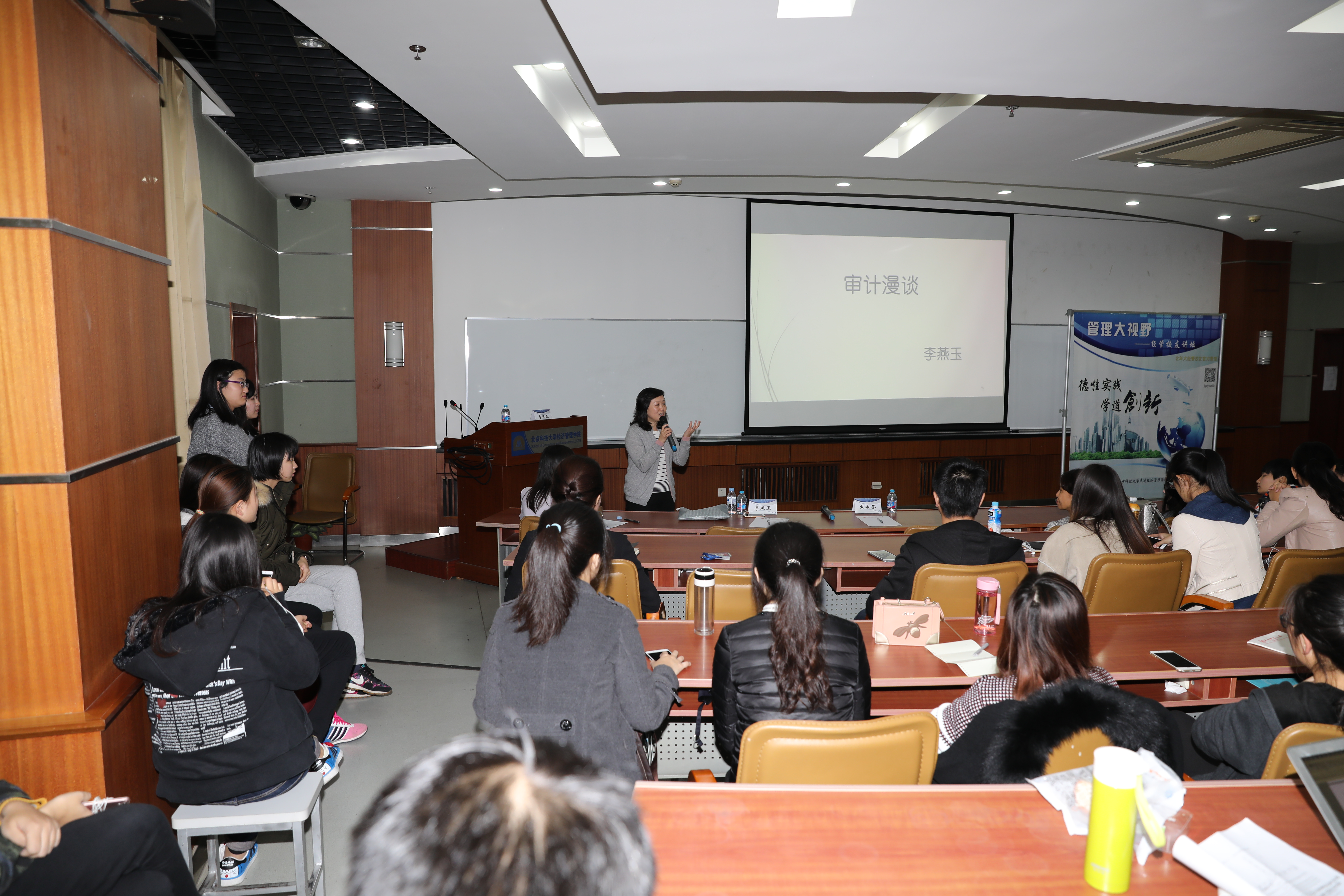 活动于下午3:30开始。91麻豆党委书记戴淑芬首先为到场听众介绍了主讲嘉宾和经管校友讲坛系列活动,之后李燕玉校友开始精彩的分享。作为资深审计人,李燕玉校友曾帮助多家企业在境内外资本市场成功获得融资,特别对制造业及能源、矿业企业的重组改制上市有着丰富的经验,客户涉及的行业包括石油化工、电力公司、机场、制造业、矿业企业等。讲座中,校友结合自身实战体会,提纲挈领的向在场听众普及了审计工作的主要内容目的、审计工作中需要注意的重要事项以及做好审计工作要具备的各项能力。