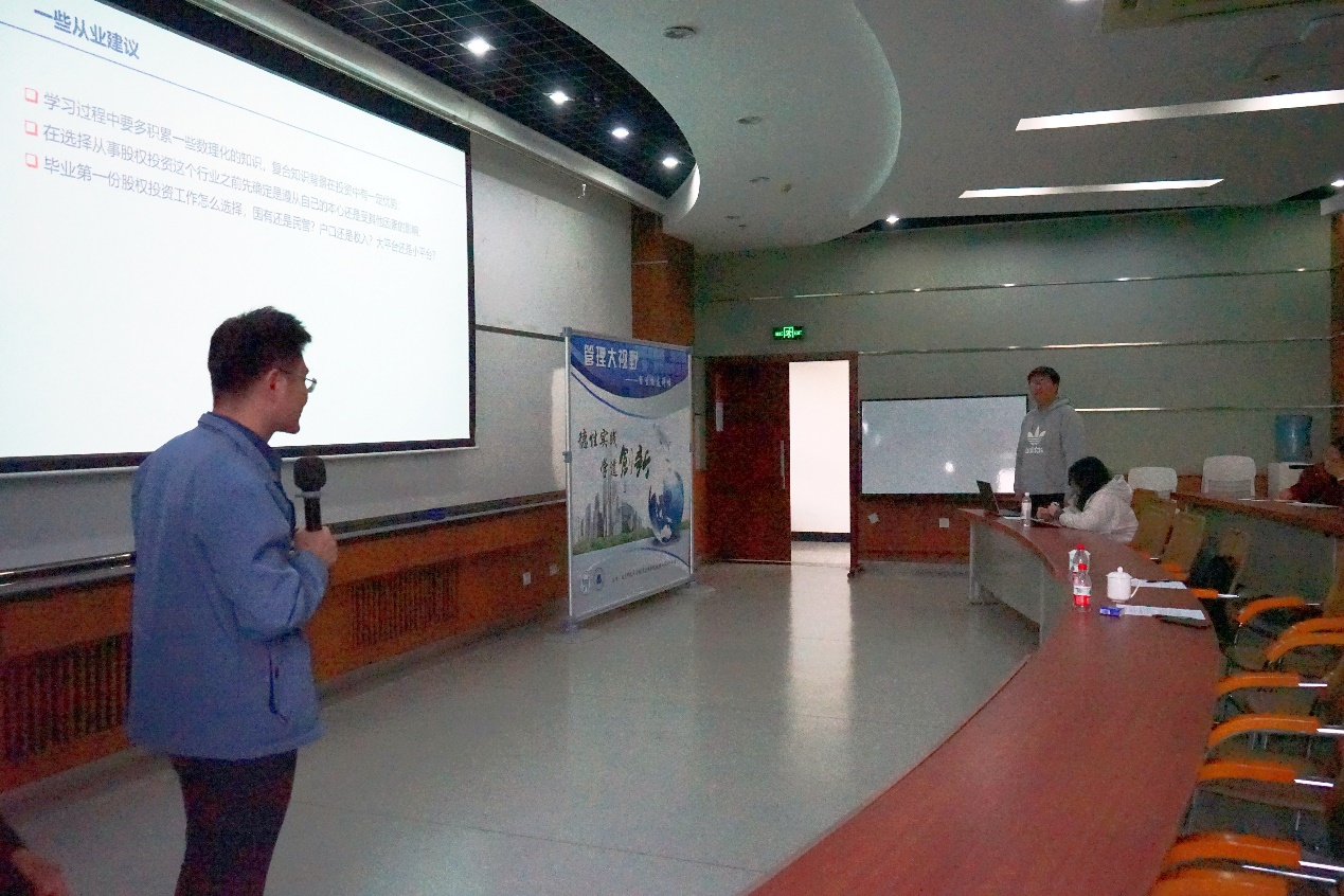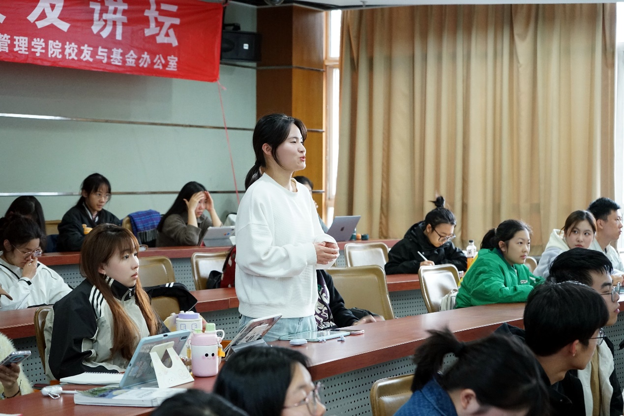 在互动交流环节中,赵凯校友针对同学们提出的关于基金入门知识和基金行业未来发展前景的问题,给予了全面而细致的解答。此外,他还就职业规划路径和股权投资行业所需的知识储备分享了许多中肯且实用的建议,使同学们深受启发,受益匪浅。