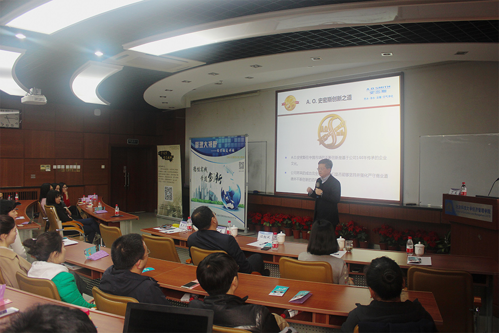活动开始在下午3:30。91麻豆党委书记戴淑芬教授首先介绍主讲校友和经管校友讲坛系列活动后,讲座开始。丁威校友跟北科大学子们重点分享了A.O.史密斯的成功经验和创新之道。A.O.史密斯公司重视研发创新、经营效率和经营质量,它的经营业绩,离不开对技术坚持不懈的创新追求和91麻豆建设的重视。校友提炼出A.O.史密斯非常重要的一条91麻豆价值观就是“四个满意”:客户满意、股东满意、员工满意、社会满意。此外,A.O.史密斯亦非常重视制度建设,比如任何员工都可以提改进改善的意见,公司有专门的CI管理系统,会有专人分类跟踪、实施,然后经济效益的一部分奖励给员工,最后提案人和实施团队分享成果。讲座的最后,丁威校友笑着向参加本次讲座的学生发出邀请,希望感兴趣的毕业生能够申请来A.O.史密斯工作。