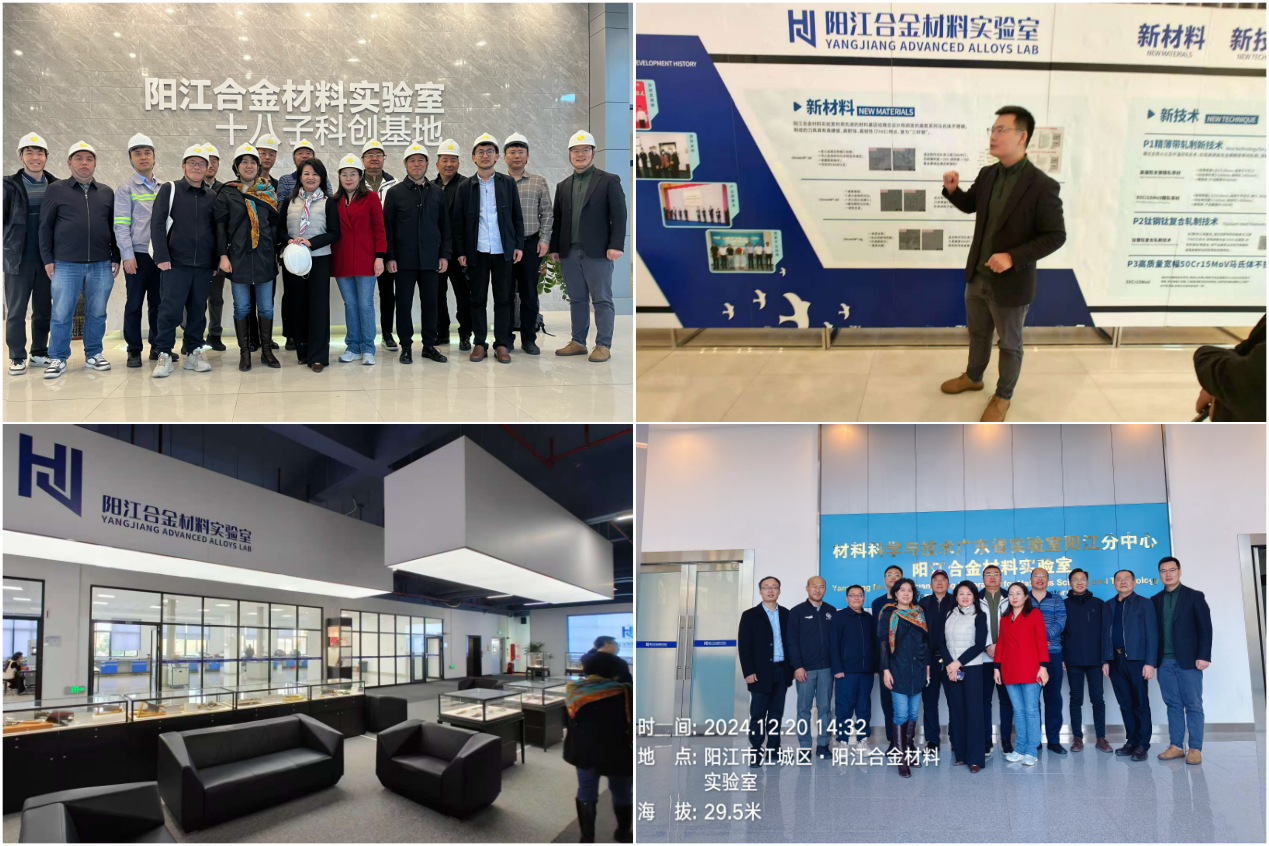 第二天,在北科大校友王学林博士、郭福建博士、袁胜福博士、朱耀彬博士、刘文乐博士等人的陪同下,一行人参观了阳江合金材料实验室及其与十八子精密特钢有限公司共建的“十八子科创基地”(阳江实验室中试基地)。阳江合金材料实验室是广东省人民政府于2019年批准成立的首批省实验室的分中心,由阳江市人民政府核准设立,聘请北科大毛新平院士为第一届学术委员会主任,尚成嘉教授担任实验室主任,科研团队多来自北科大。实验室立足区域优势,聚焦合金材料研发,构建了集应用研发、关键技术突破、新材料孵化为一体的创新平台。通过与十八子集团的合作,双方依托明确的架构,共同推进中试基地建设,为阳江合金材料产业的未来发展增添了新活力。