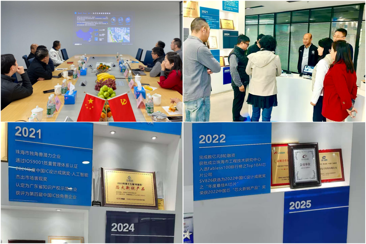 活动首日,企业家分会一行参访了电95级校友陈锋创立的珠海亿智电子科技有限公司。亿智电子作为AI机器视觉算法和SoC芯片设计为核心的系统供应商,专注于边缘侧/端侧通用算力AI SoC芯片的研发,其产品线覆盖智能车载、智能硬件、智慧安防三大领域,展现了强大的自主研发和量产能力。陈锋校友详细介绍了公司的核心产品,还分享了宝贵的创业经验,与会者围绕芯片技术与发展趋势进行了深入的交流与探讨。