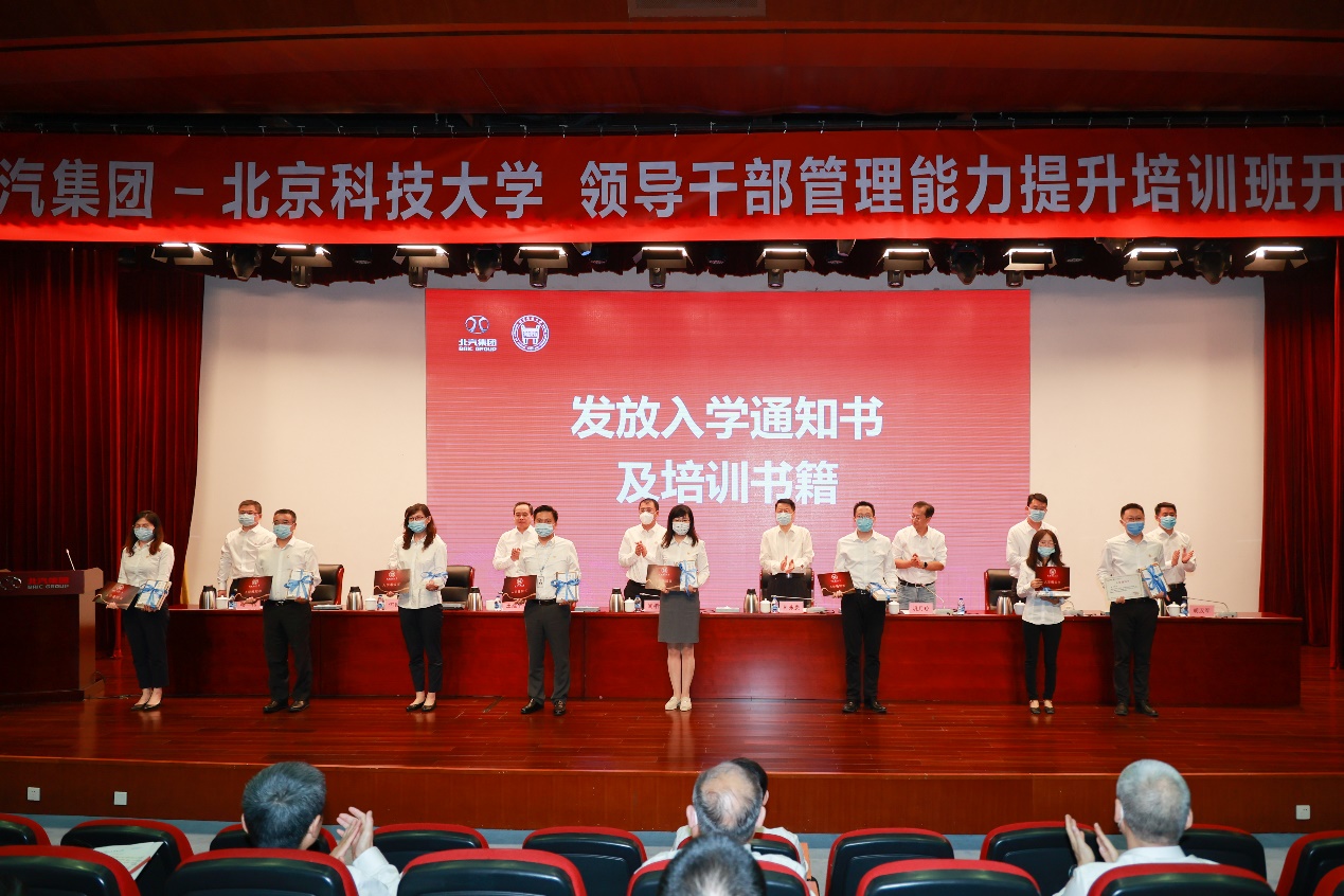 随后,双方领导为学员代表颁发了入学通知和学习教材。北汽鹏龙党委副书记、常务副总经理潘浩代表参训学员发言,他表示全体学员将提高政治站位,牢记参训使命;严格要求自己,完成学习任务;注重成果转化,加快能力提升,圆满完成此次学习任务。