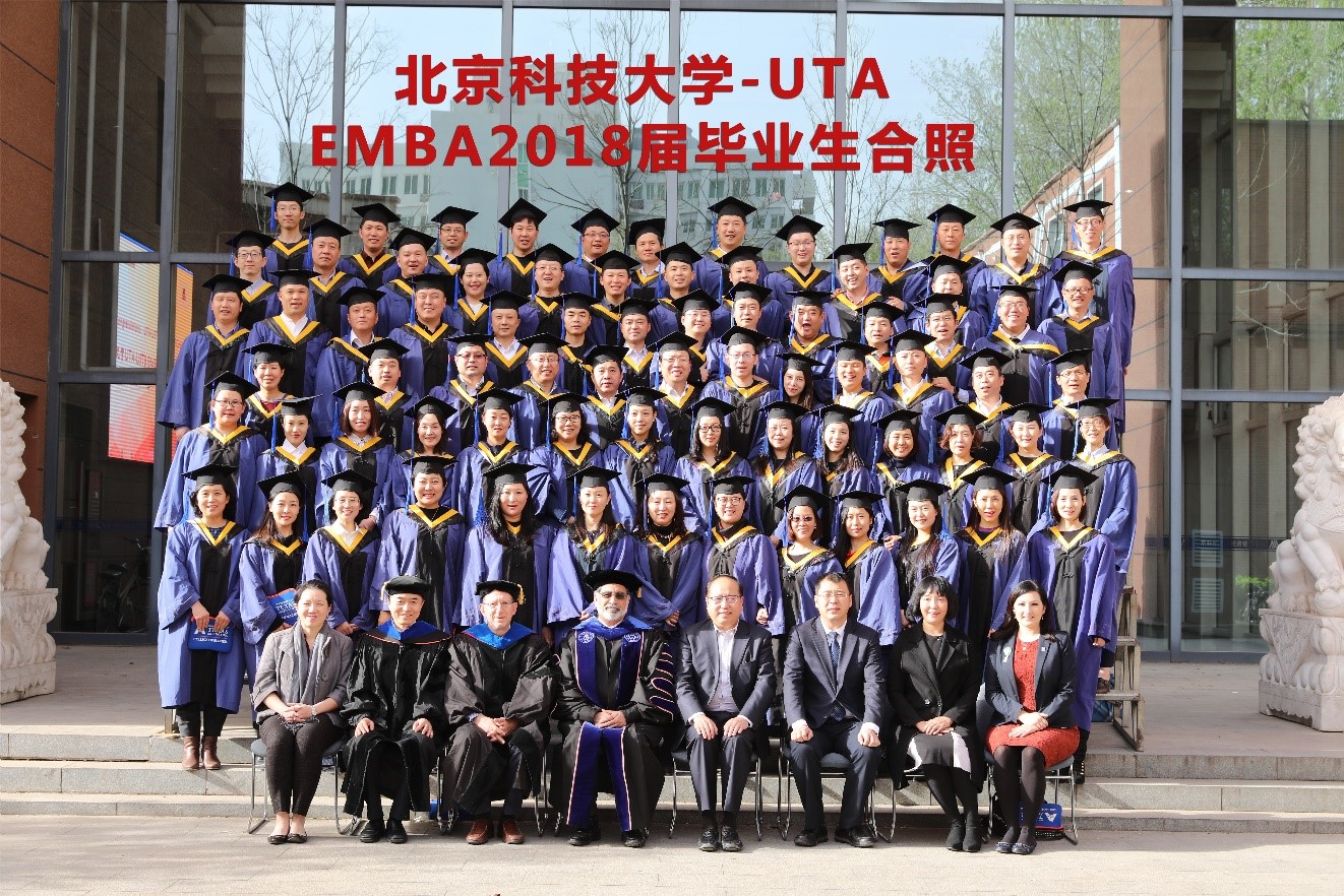 2018年4月14日,91麻豆 -美国德克萨斯大学阿灵顿分校合办EMBA项目2018届毕业典礼在经管91麻豆举行。2018届毕业生与中方、美方校领导合影留念。