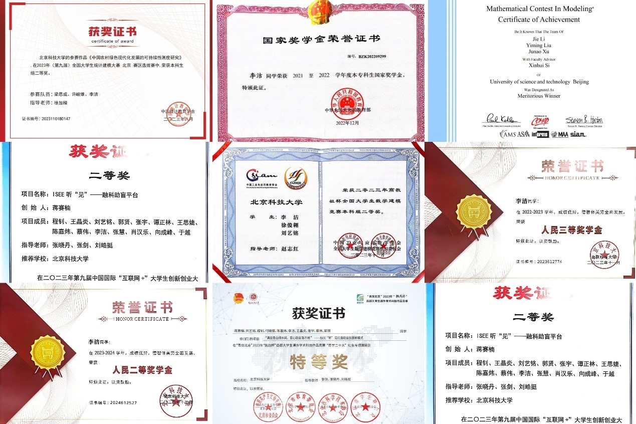 2024美国大学生数学建模竞赛M奖、2023年高教杯全国大学生数学建模竞赛全国二等奖、第九届全国大学生统计建模大赛北京赛区二等奖、2023年“挑战杯”首都大学生课外学术科技作品竞赛特等奖、第九届中国国际“互联网+”大学生创新创业大赛北京赛区二等奖。