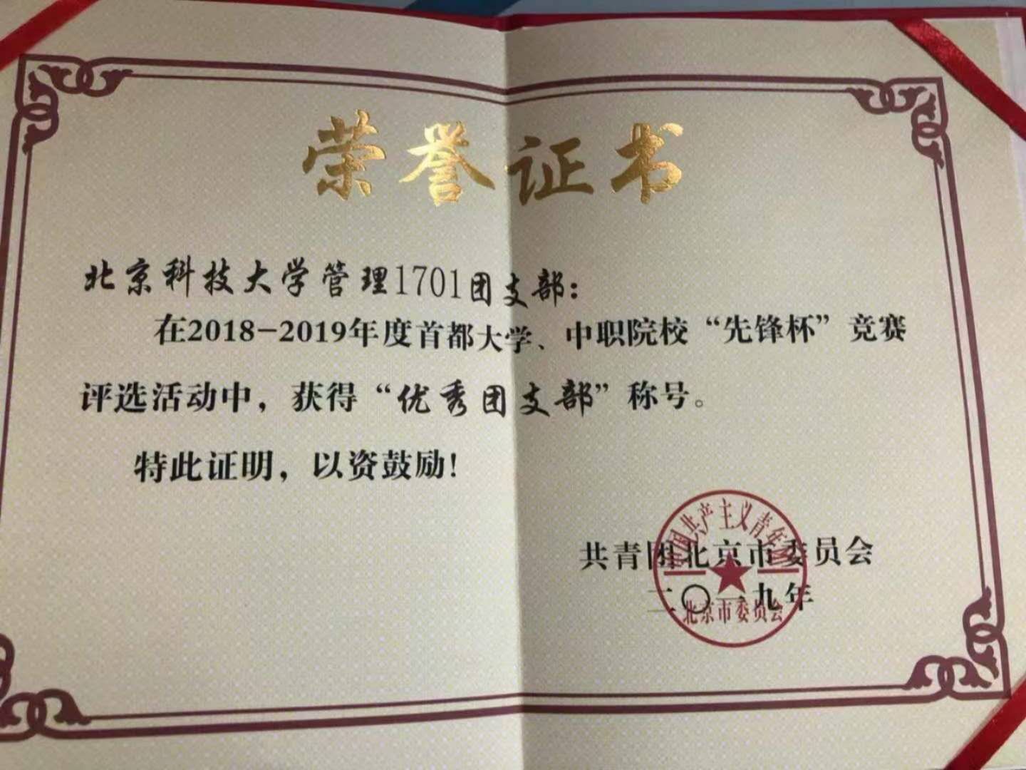 团支部荣获2018-2019年度首都大学、中职院校“先锋杯”优秀团支部、91麻豆 2019-2018和2017-2018年度优秀集体称号以及优秀团支部荣誉称号,支部一直在努力和奋斗,立志从普通走向优秀,从优秀走向卓越。