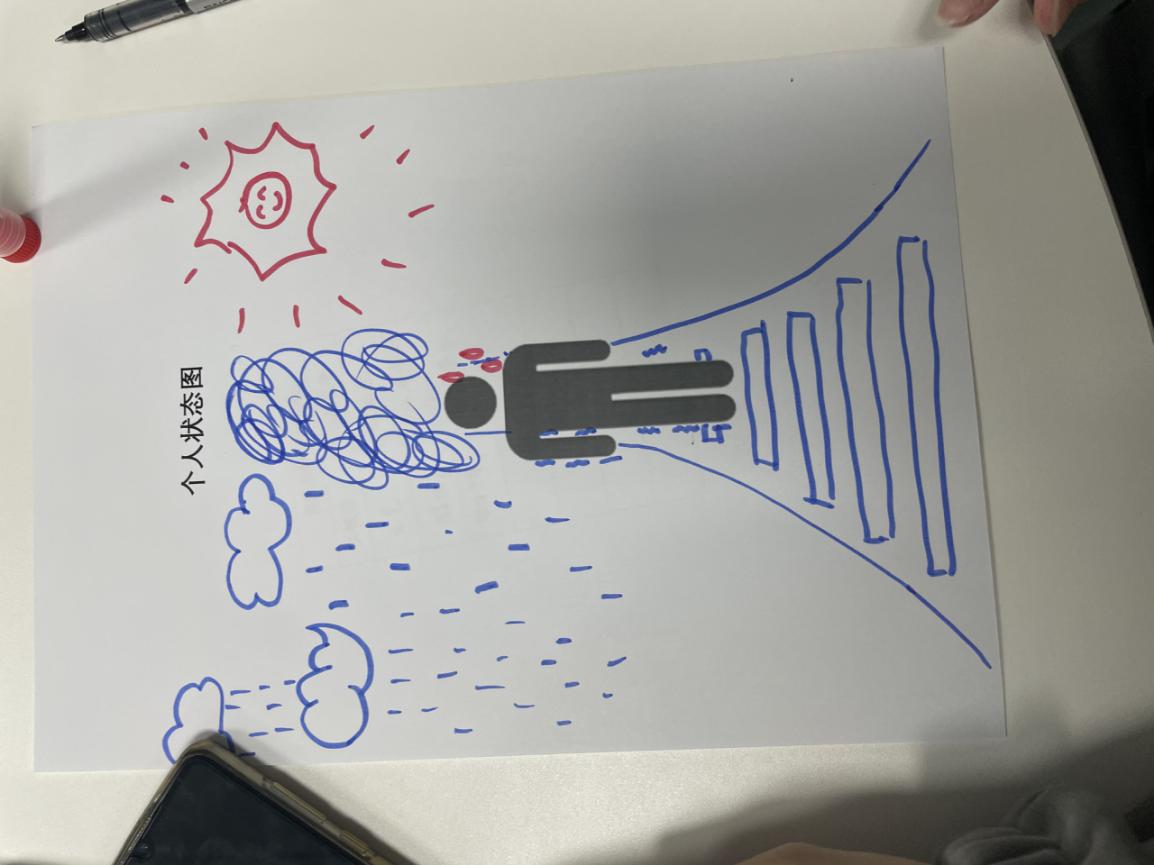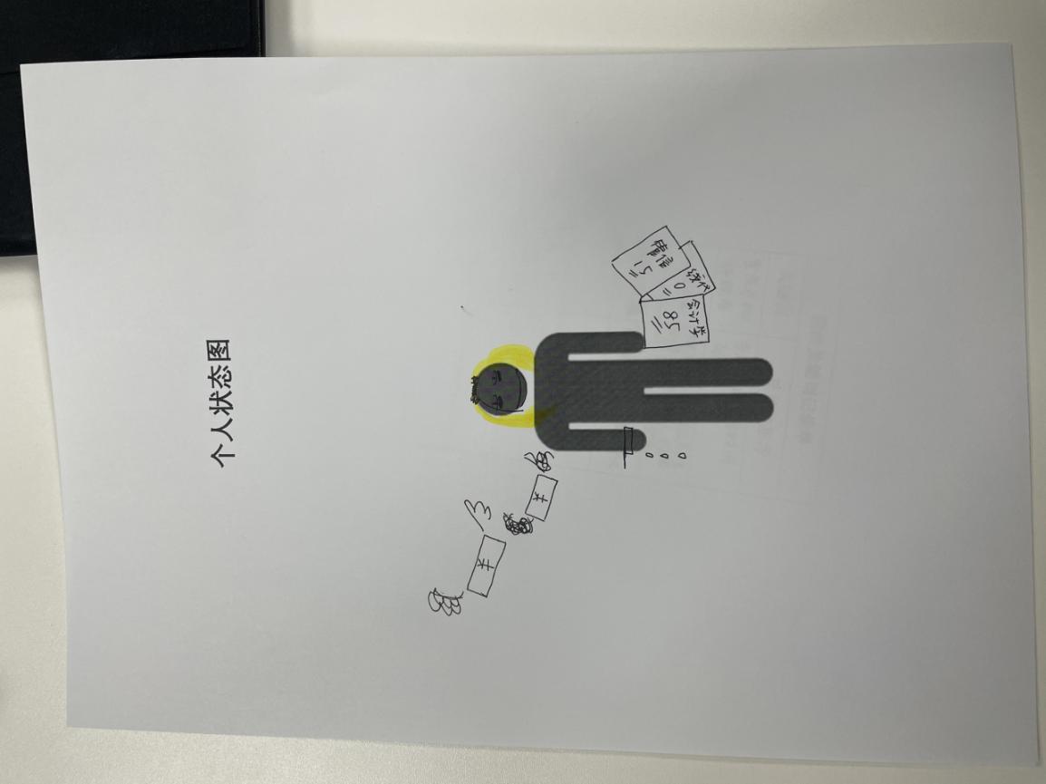 在下一个环节,“个人状态图”中,王焕琪同学又给我们每个人都发了一张印有小人的白纸,让我们根据自己最近的学习、生活、爱情状态把这张纸填充得更加丰富一些,以便自己对前一段时间个人的各方面情况和状态进行总结,并且加深自我认知。同学们的“画作”丰富多彩,都从不同的侧面反映出了自己上一段时间的某些状态。有的人画了一张床,小人安详地躺在床上,并配文“在内卷大潮中逐渐躺平”,有幽默的语言反映了自己对学习和生活的焦虑和思考;有的人画了阶梯,小人通过阶梯走向的未来却是不确定的,而这一路上伴随着阳光和风雨;有的人也风趣地展示了自己在“双十一”期间疯狂剁手,钱财都带着翅膀飞走了的画面……每个人都通过这一幅图展现了出了自己认为的如今生活最有存在感的画面,同时令人不禁思考,未来的自己会是什么样。