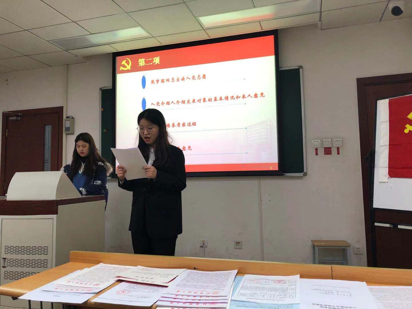 会议伊始,全体起立,面向国旗,奏唱国歌。随后,发展对象熊梦圆同志宣读入党志愿,就其履历、社会关系等情况进行了汇报,表达了请求加入党组织的强烈愿望。