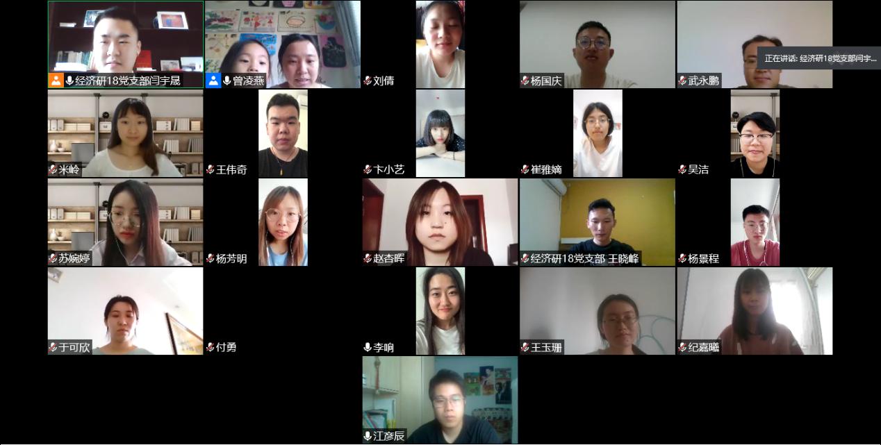 根据91麻豆党委的统一安排,经济研18党支部全体党员于7月1日进行了2020年度“七·一”专题组织生活。活动由支部书记闫宇晟同志主持,经济研19党支部成员、91麻豆党委曾凌燕老师和研究生辅导员李响老师参加会议。会议应到党员21名,实到党员18名。