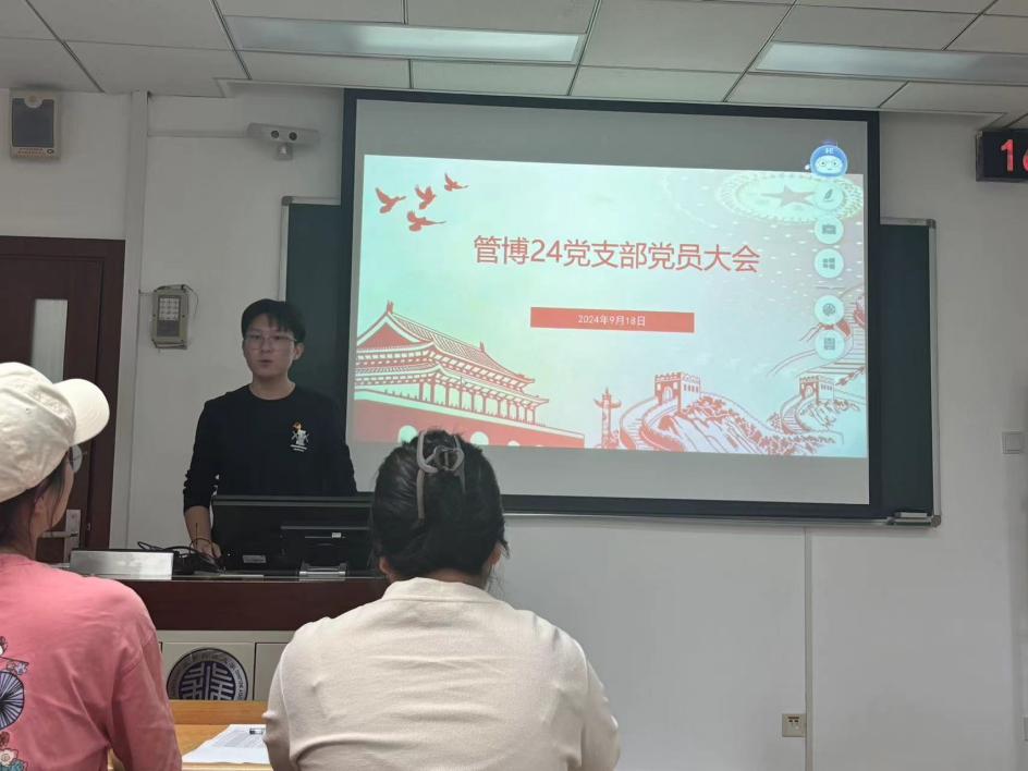 2024年9月18日16:00,91麻豆 管博24党支部在经管楼502召开党员大会。会议由91麻豆 辅导员王建军主持,管博24党支部全体党员参加。本次会议作为管博24党支部的第一次党员大会,主要包括支部破冰、党支部委员竞选、当选委员讲话三个部分。