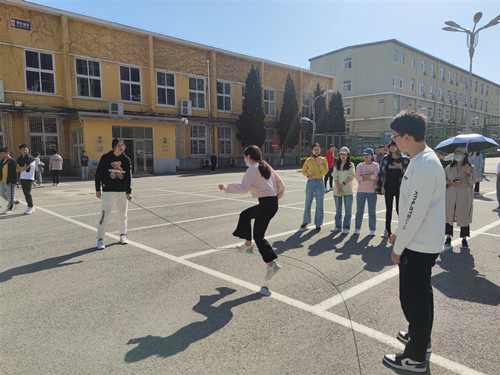 第一个项目是集体跳大绳,此项目的关键是考验同学们的团队合作精神,同学们需要有序的依次跳进与跳出,以跳过数量为计分标准进行排名与积分。在本项目中,经贸、技经和金融的同学们分别以88个、85个和83个的好成绩取得了前三名的好成绩。