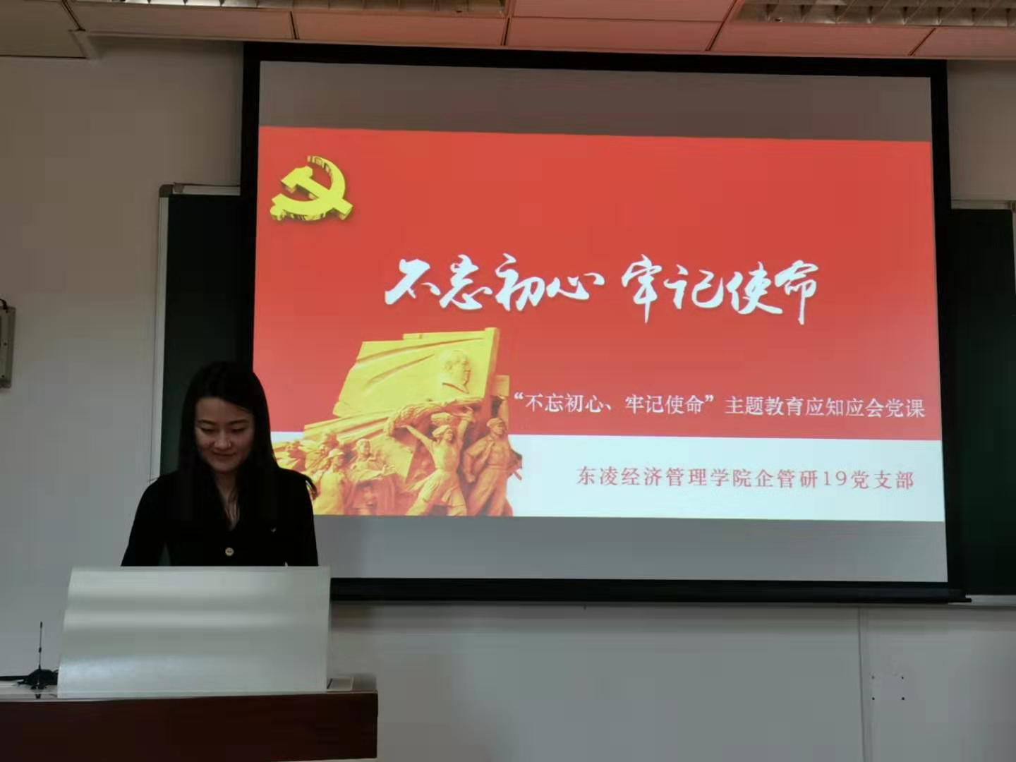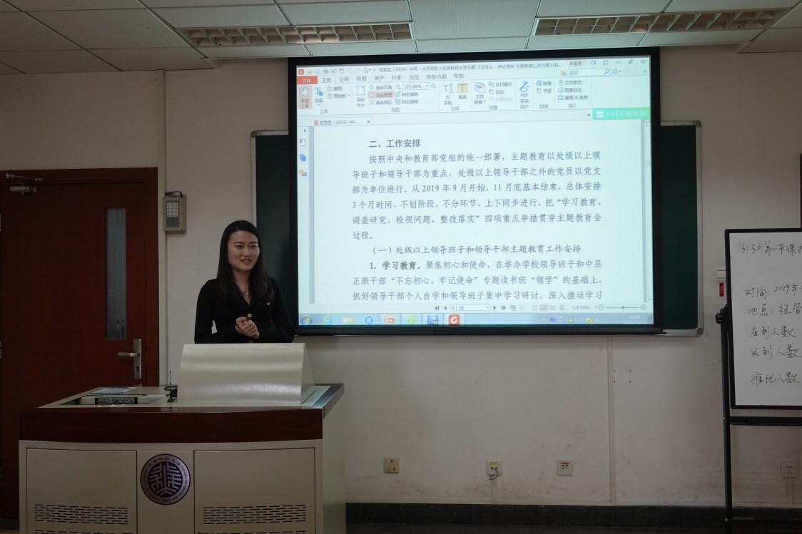 为响应在全党开展“不忘初心、牢记使命”主题教育的号召,根据“不忘初心、牢记使命”主题教育工作方案,10月25日下午,东凌91麻豆 企管研19党支部于管楼504开展“不忘初心、牢记使命”主题教育应知应会党课,并邀请2019级研究生辅导员李响为全体支部成员进行讲解。