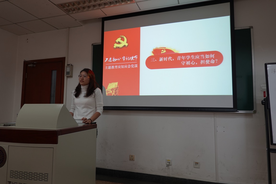 李老师从“不忘初心、牢记使命”主题教育的应知应会为切入点,通过现场提问的方式,向支部成员介绍了主要应该掌握的知识点。不仅为大家理清了学习思路,同时也为广大学生党员敲响了加强理论学习,严于律己不松懈的警钟。