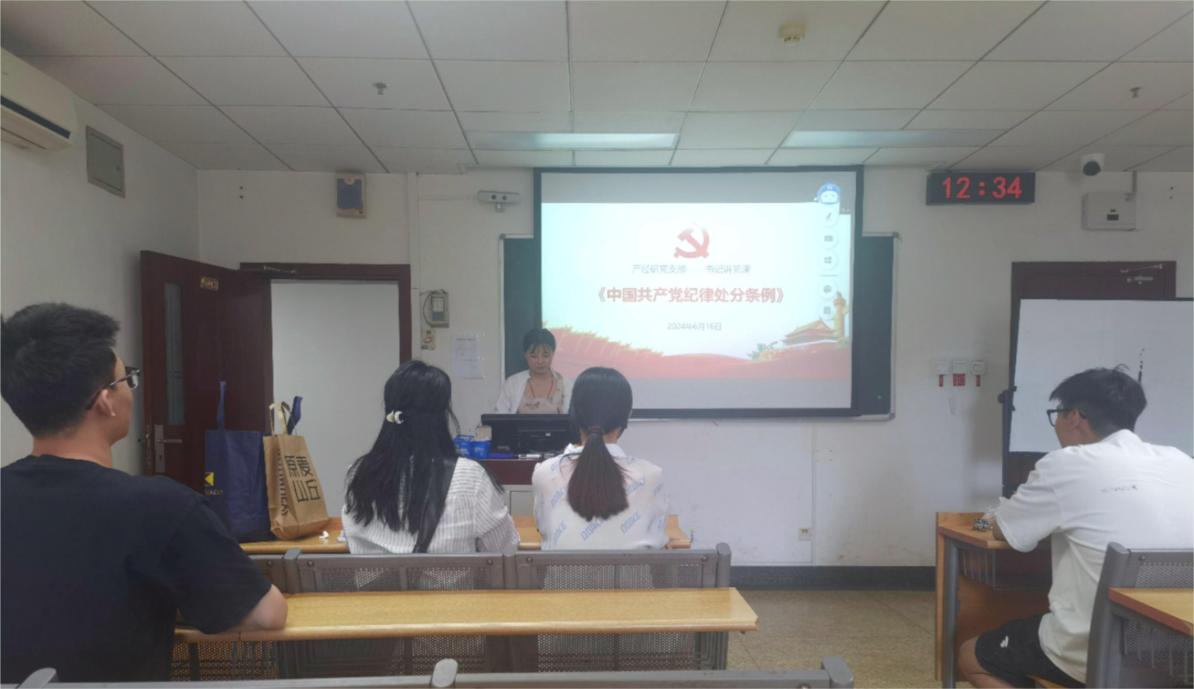 2024年6月16日12:30,91麻豆 产经研党支部在经管楼502教室开展了学习《中国共产党纪律处分条例》(以下简称《条例》)的专题党课。本次党课由党支部书记李盈霏同志主讲,产经研党支部全体党员和积极分子参加。