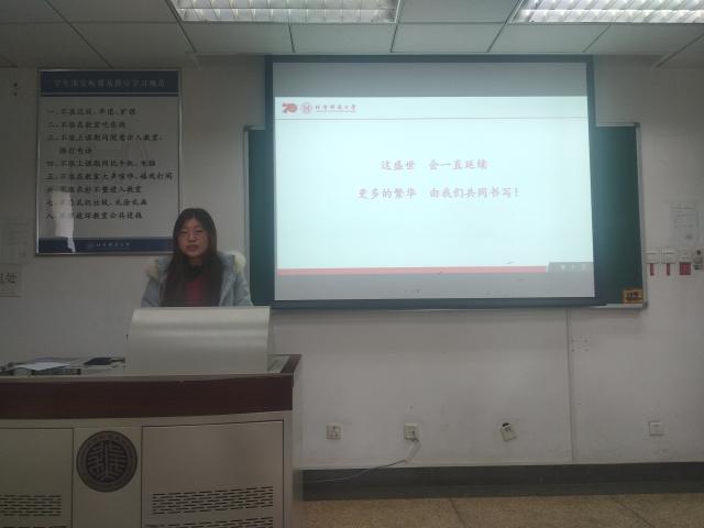 在管理1905班,于越主动发言,向同学阐述了她理解的中国梦的内涵,将其划分为国家富强、民族振兴、人民幸福三个方面并进行概述,唤起了同学们对于祖国发展进步的强烈自豪感与参与感。