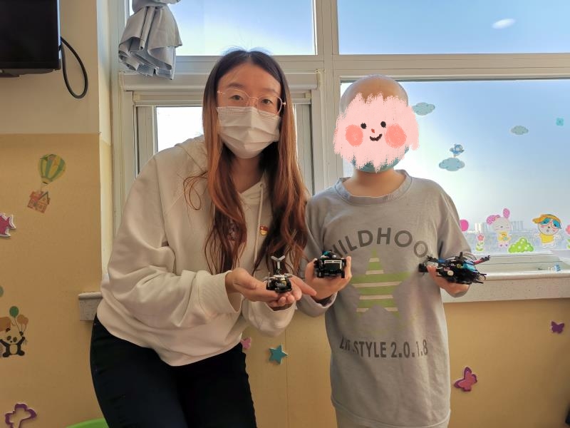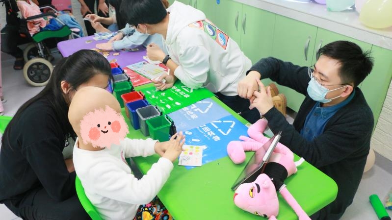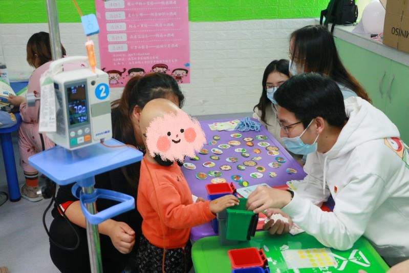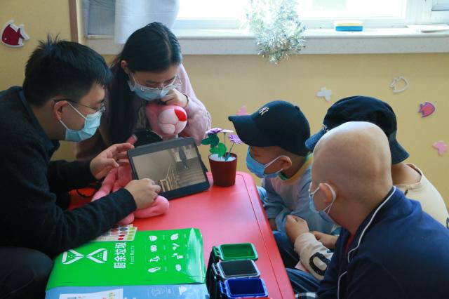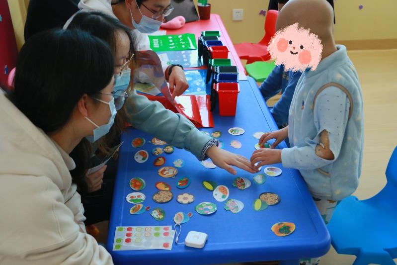 垃圾分类游戏。虽然小朋友每天都在医院接受治疗,不能去学校,但是他们依旧好学,垃圾分类的知识都有所了解,看着他们快速掌握,正确地把垃圾扔进对应的垃圾桶里,为他们感到高兴。