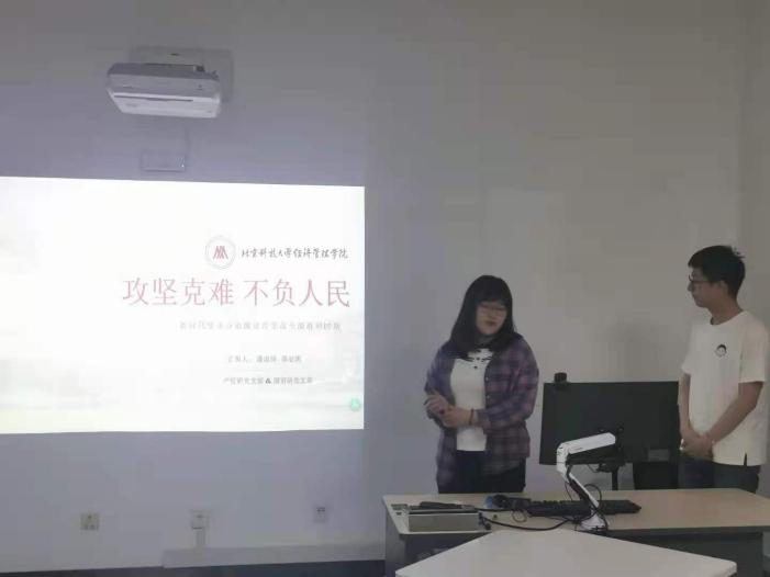 紧接着由产经研党支部党员潘淑琦和国贸研党支部党员陈必凯同学合作进行分享,他们的主题是“攻坚克难,不负人民”,首先潘淑琦同学介绍了中国扶贫的70年历程,然后分享了90后“第一书记”赵军章同志的工作事迹以及取得的成果,是青年党员办实事解民忧,破难题暖民心的实力典范,赵军章同志表明自己会继续留在基层工作,在基层进一步奉献自己的青春。