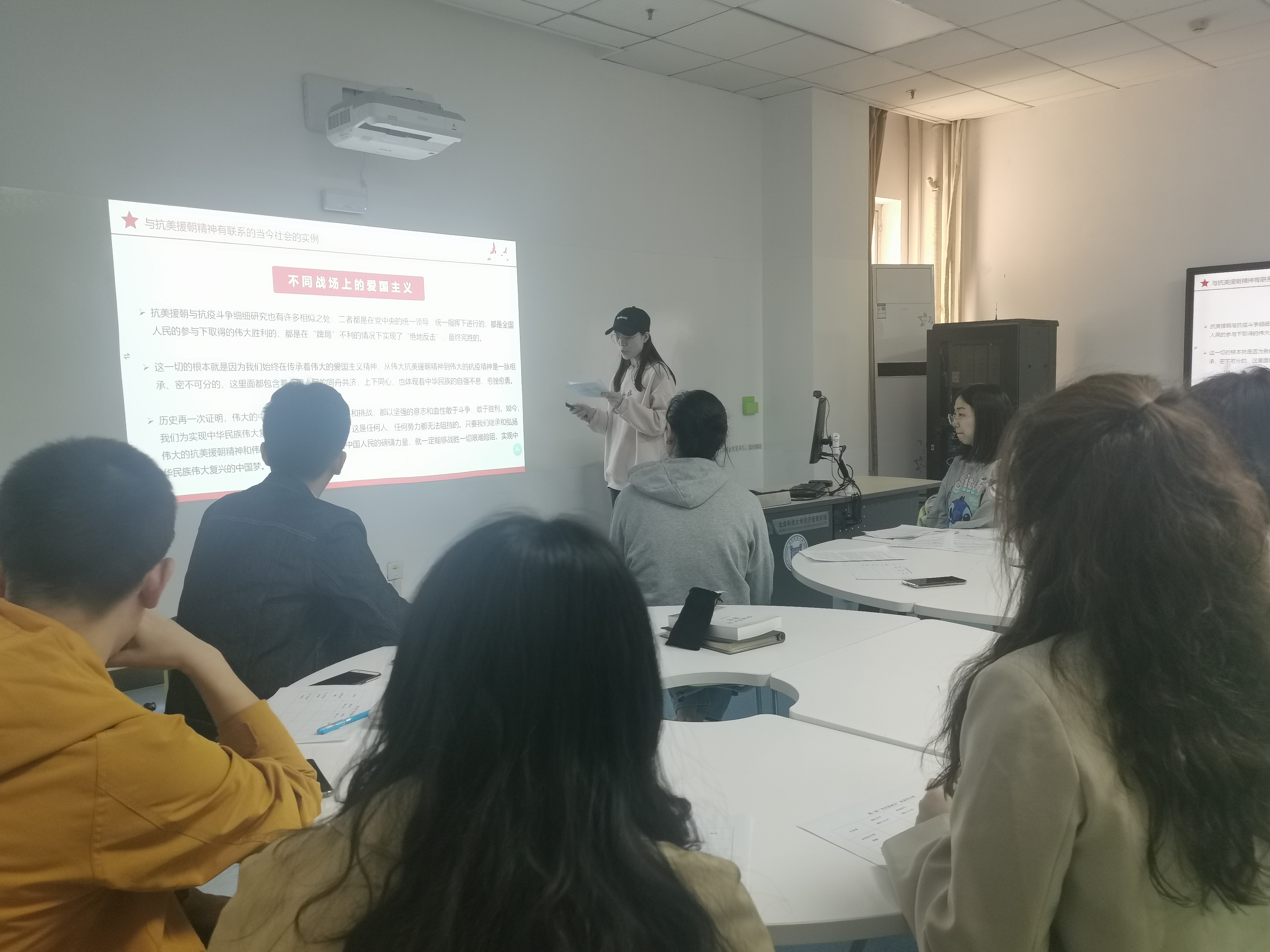 接着本17党支部党员刘庆超继续分享,她将抗美援朝精神联系当今社会实例,以抗击新冠疫情为例,表达了不同战场上的爱国主义精神,启发高校党员在任何时代都要继承和发扬党的光荣传统,拥有一颗责任心、进取心、平常心。