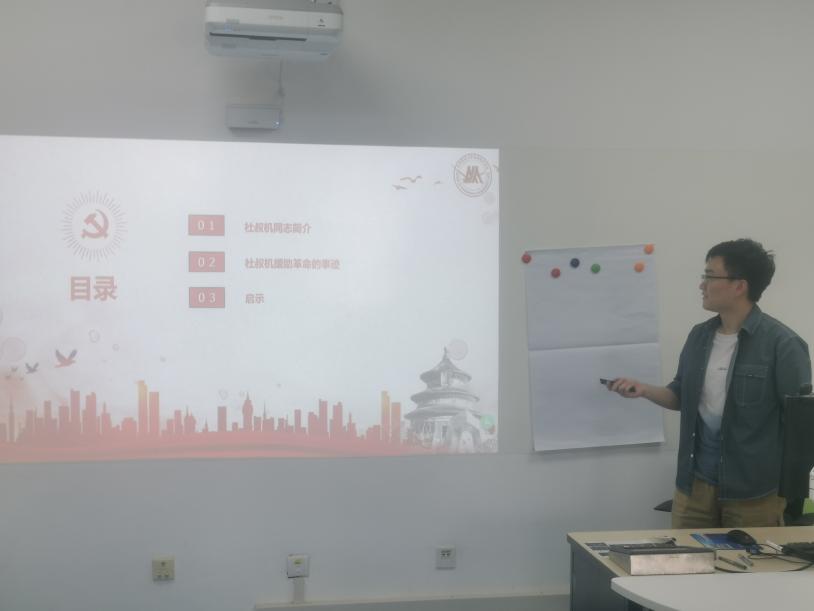 第二位分享由会计研党支部党员潘孝全同学进行,他分享的主题是“弘扬革命精神,争做有志青年”,潘孝全同学介绍了中共党员杜叔机同志的事迹,杜叔机同志从事教育,思想进步,深受蔡元培先生倡导的“思想自由,兼容并包”所影响,不仅如此,杜叔机同志帮助反蒋示威“首犯”陈沂同志脱狱,奔走营救了许多共产党人和进步人士,为中国共产党做出了重要的贡献。“奉献”一词诠释了杜叔机同志的一生,新一代青年要学习杜叔机精神,以奉献为榜样,为社会主义现代化建设添砖加瓦。