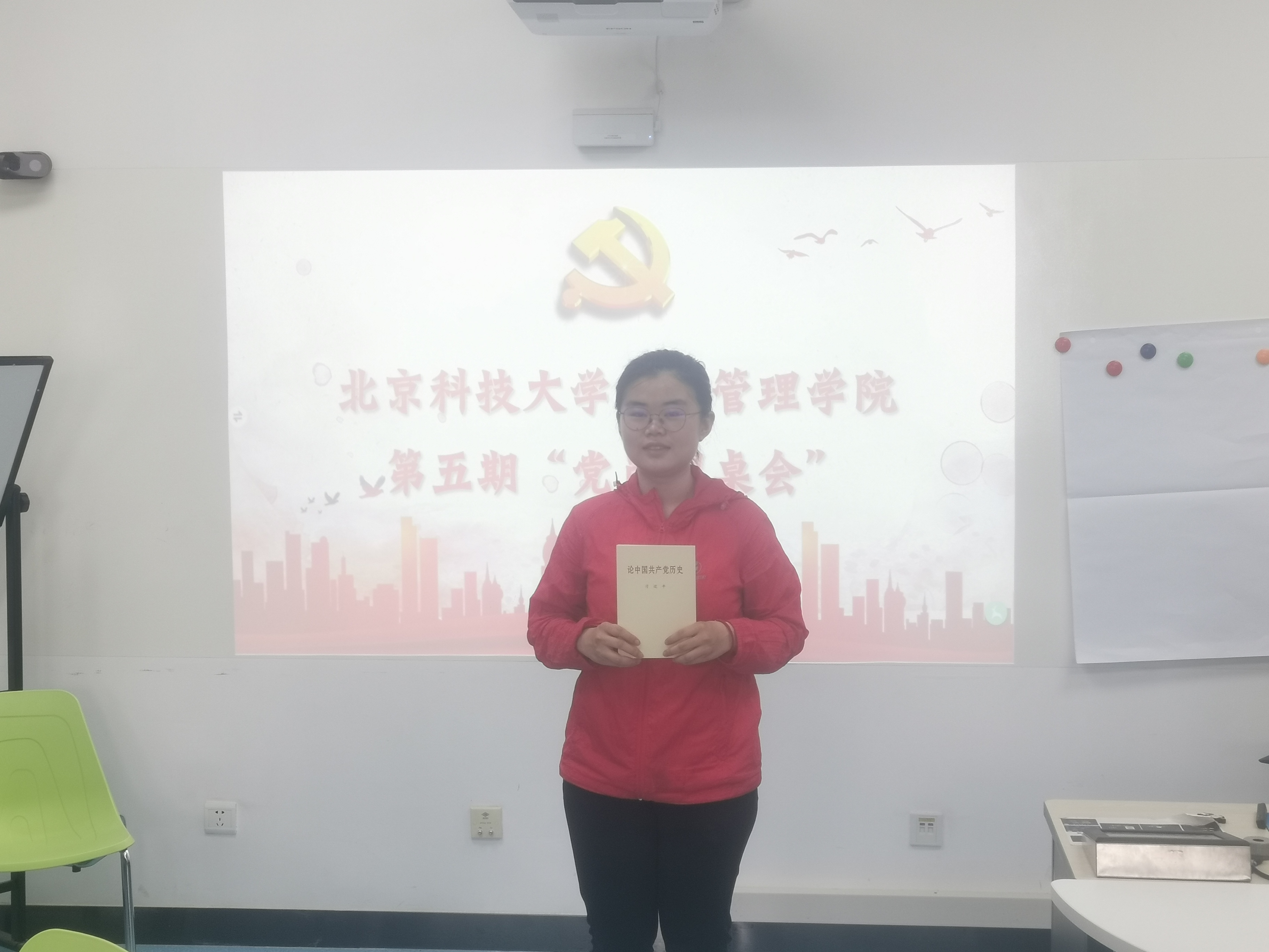 经结算,本低党支部党员任霄霄同学的汇报得分最高,成为了本期活动的“圆桌之星”,作为激励,张洪榛老师将一本全新的《论中国共产党历史》送给任霄霄同学。
