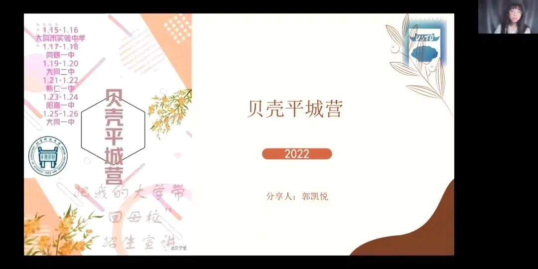 第一位分享经验的是贝壳平城营的队长郭凯悦。她从前期准备、实践过程、创意宣传活动、经验总结四个方面分享了自己的寒招经验。在前期准备阶段,她分享了团队的分组、小礼物制作、前期宣传的经验。在实践过程中,她分享了团队举办的各种宣讲活动,如举办多校联合宣讲大会等。在宣传活动方面,她分享了团队的各种创意活动。在经验总结部分,她强调要提前联系母校老师以及设计队徽和海报,根据实际情况确定宣讲形式,同时尽可能多的联系学校,以及在宣传中带入创新。