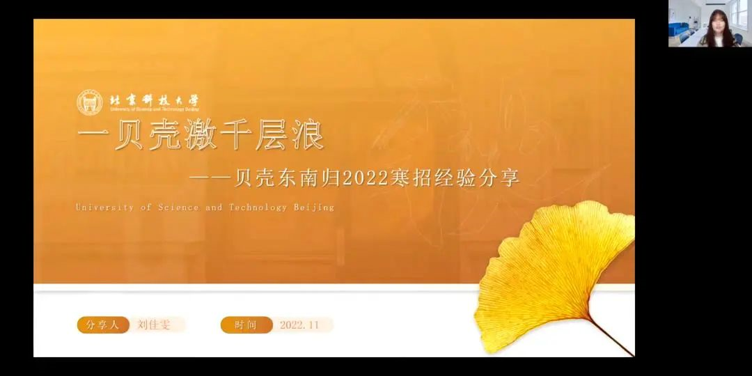 第二位分享经验的是贝壳东南归2022的队长刘佳雯。她从联系学校,宣传技巧,宣讲策略三个方面分享了经验。她指出,在学校选择方面,要尽可能联系多所学校宣讲。在宣传方面,要利用新媒体平台进行多元化宣传,平时注重素材的积累,同时有特色才是关键。在宣讲方面,以学校发的文件为基础,以队伍自制的特色宣传作品为杀手锏来进行宣讲。