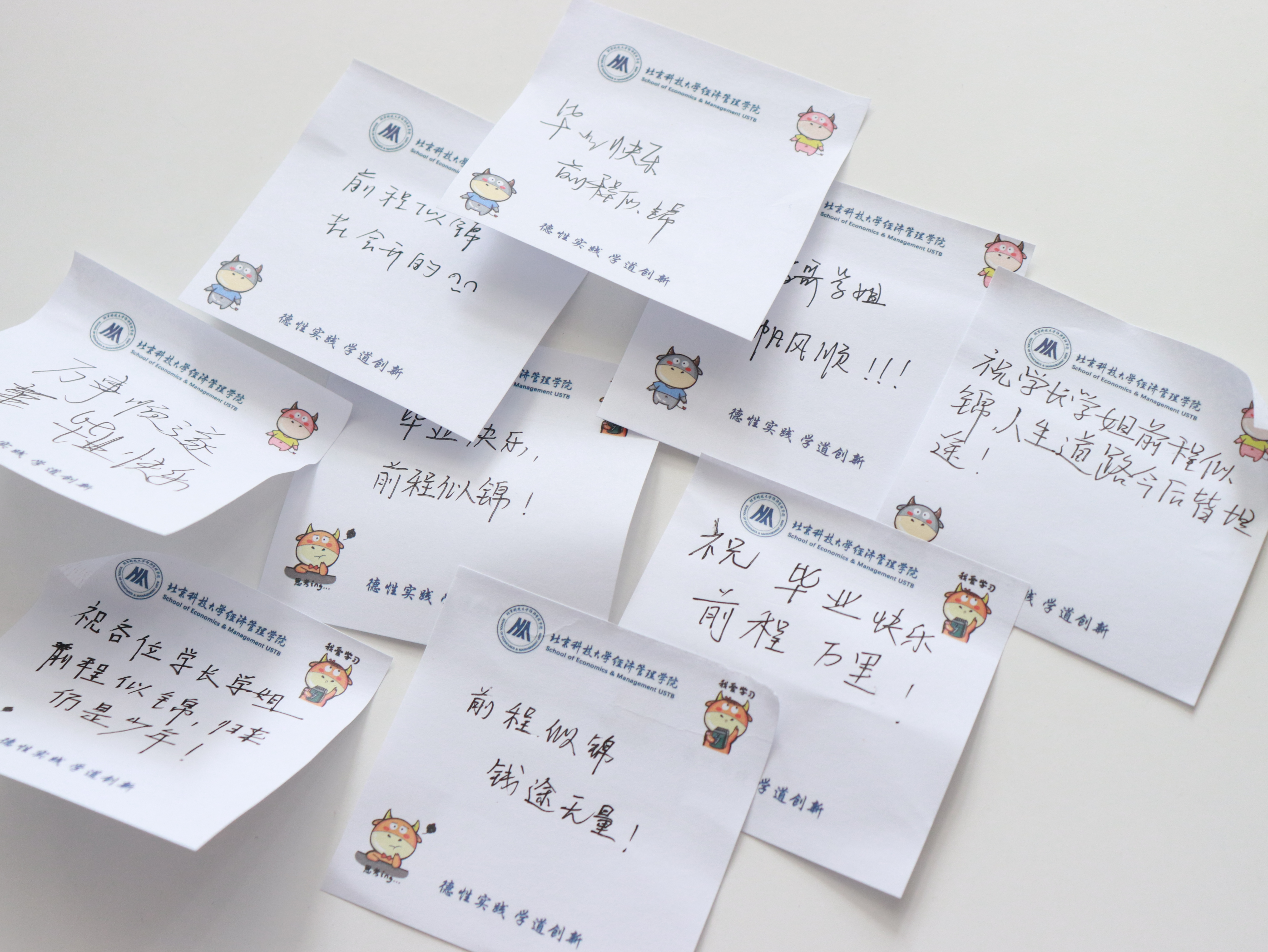 同学们在挑选完心仪的图书后,纷纷在经管文创便利贴上写下了对学长学姐们的祝福,表达着对这份爱心传递的真挚情感。