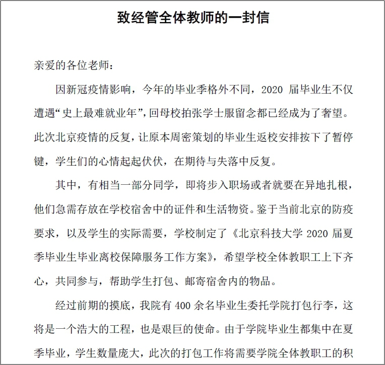 通知发出后,得到了老师们的积极响应,除暂不在京、处于中高风险地区等部分特殊情况的教师外,包括全体领导班子在内的114名教职工全部参与。在财务处、体育部、保卫保密处、后勤集团老师及员工的共同协助下,圆满完成2020届毕业生宿舍物品打包及寄送工作。截至7月4日下午16:00,所有委托寄送或暂存的毕业生共419名,个人物品全部处理完毕。
