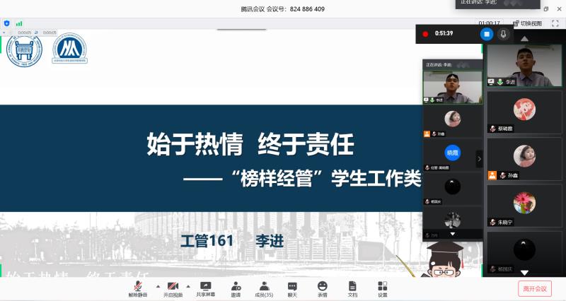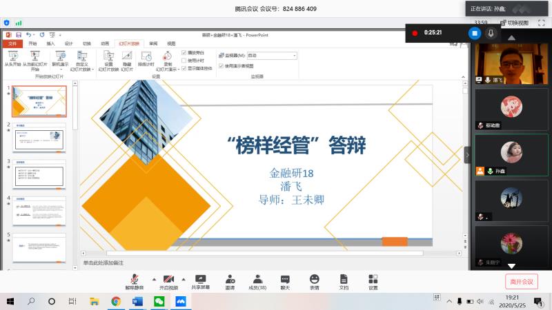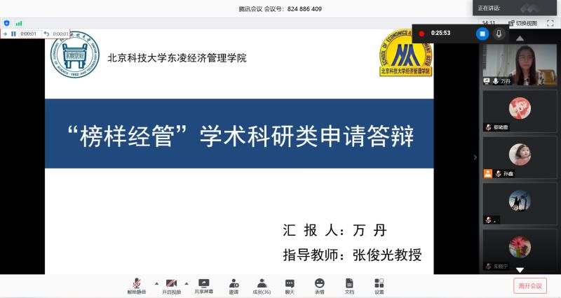 最后,武森老师发言。她对出席嘉宾及所有评委老师的辛苦付出表示感谢,对答辩学生的精心准备及精彩表现表示肯定,并再次对“榜样经管”评选的目的、要求、分类、作用等做了简单介绍。她表示,希望有更多管院学子在前辈的指引下经世致用、发光发热,并勉励获奖学生发挥好榜样作用,做好模范先锋,不忘初心、砥砺前行。至此,经管91麻豆第一届“榜样经管”线上答辩会圆满结束。