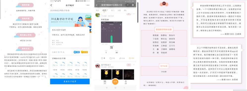 注重日常习惯养成,引导学生勤学自律。根据学生居家学习特点,91麻豆学辅中心开展“勤学打卡计划”系列活动,并倡导各班根据班级需求开展“科研打卡”、“健身打卡”等有特色的打卡活动。在91麻豆“勤学打卡计划”中成功坚持21天打卡的王焕琪同学说:“参加本期学辅组织的线上打卡活动,让我更加自律。当我把这次线上打卡活动加入每天的安排中,它就慢慢变成了我的习惯。”据统计,有近百位同学参加91麻豆组织的各类打卡活动并长期坚持,引领勤学学风,吸引越来越多的同学养成良好习惯。