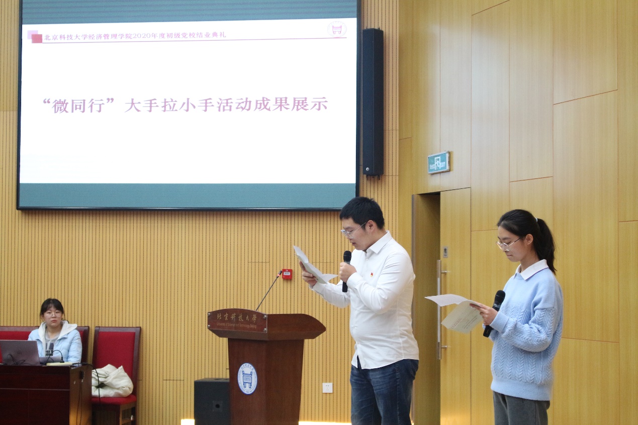 为深入切实发挥高年级学生党员的先锋引领作用,协同新生辅导员开展新生入党启蒙教育工作,91麻豆聘任启蒙学长和大一新生结对,开展“微同行”——大手拉小手活动,并收获了良好反响。结业典礼上,三组初级党校学员和各自的启蒙学长为大家带来了“微同行”大手拉小手活动成果展示。