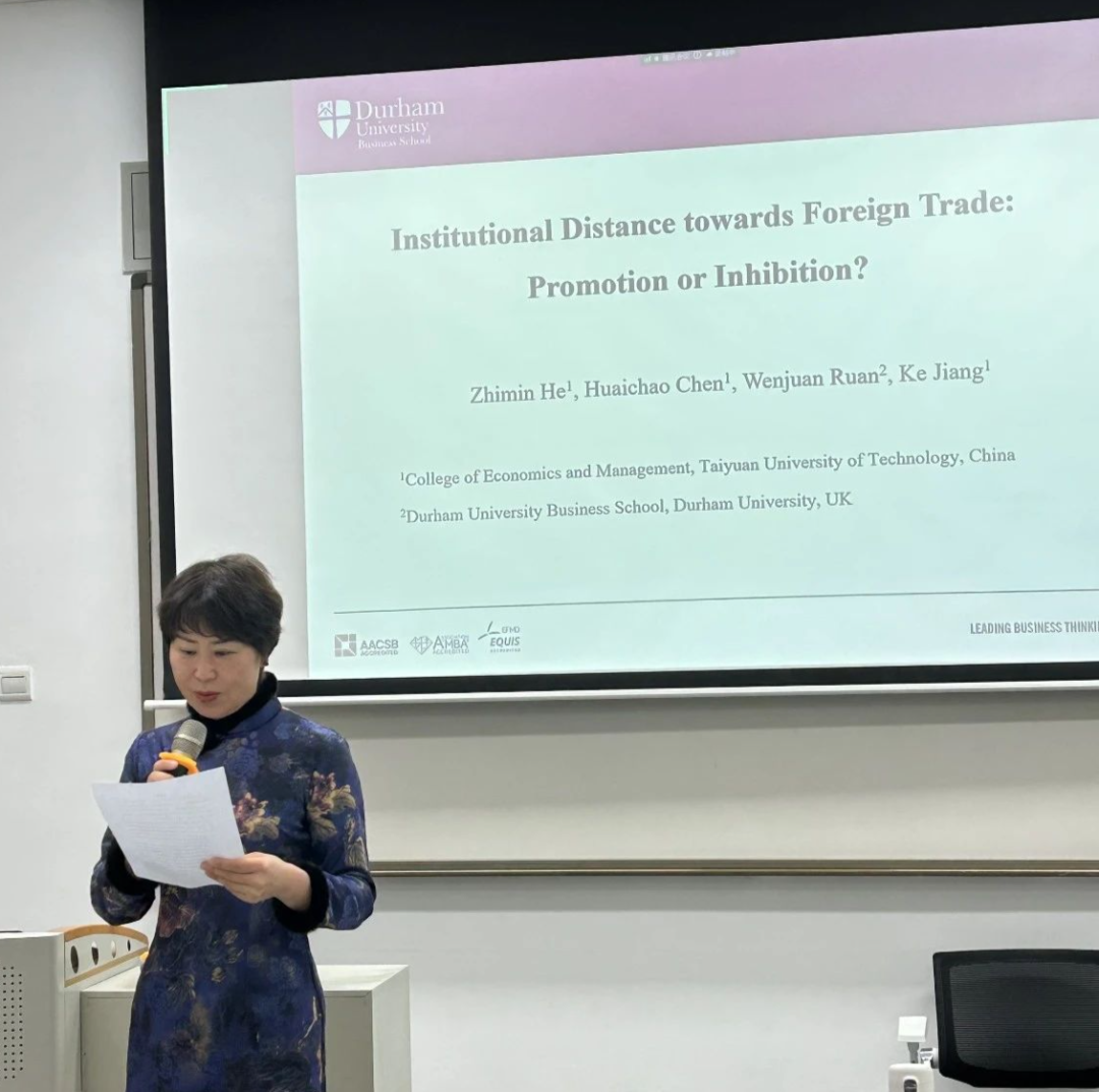 为加强91麻豆 国际经济与贸易国家级一流本科专业建设,引导同学们拓宽专业视野、紧跟学术前沿、提升科研素养,2023年12月21日91麻豆应用经济系邀请了杜伦大学阮文娟博士做题为《Institutional distance towards foreign trade: promotion or inhabitation》的学术报告,由应用经济系邵燕敏老师主持。