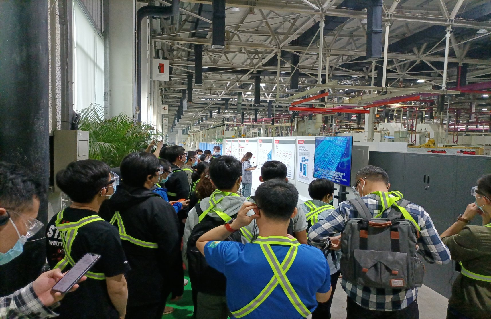 本次参访活动组织人董智慧同学边走边给大家讲解福田康明斯的“福康智造”系统(CMES制造执行系统),它是由康明斯统一研发并在全球推广,在所有中国的合资公司中福田康明斯首批使用,可以实现实时装配、防错和生产数据自动记录功能的数字化标杆制造执行系统。具有以下三个特点: