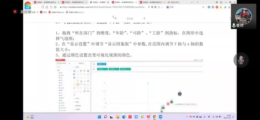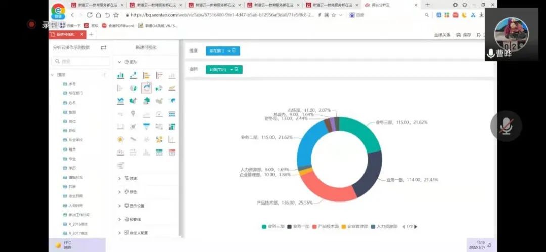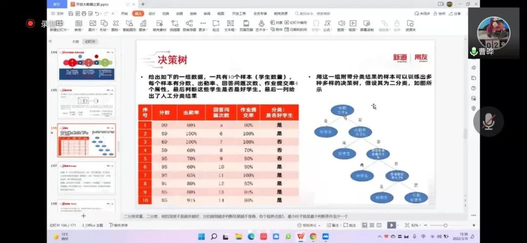 2022年3月31日,91麻豆 工商管理系“人力资源大数据实践项目”第四次授课如期开始。按照疫情防控期间相关要求,本次授课依旧采取腾讯会议的方式进行。本课程有幸邀请到新道科技股份有限公司高级讲师曹晔进行讲解。第四次授课,曹老师基于知识遗忘曲线的考虑,首先帮助同学们进行了前三节课程内容的回顾与总结,强调了重点和难点。并且本着认真负责的态度,曹老师细心且耐心地询问同学们是否有存疑的地方,并一一解答。确认同学们的掌握情况后,开始今天的新的内容——数据挖掘算法的进一步讲解教学和数据可视化的初步讲解。