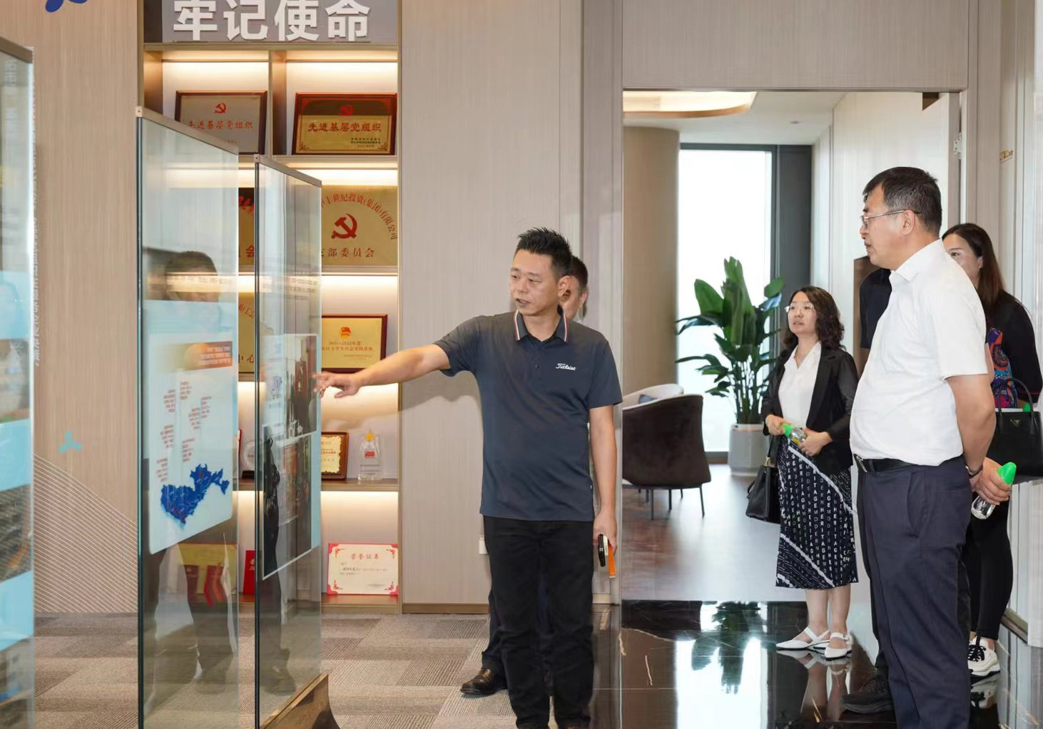闫相斌一行参观了华丰世纪集团旗下的华海金融创新中心。欧阳文道对闫相斌一行表示热烈欢迎,并介绍了深圳华丰世纪集团的发展历程以及华海金融创新中心的建设情况。欧阳文道表示,自己作为校友,一直都关注着母校发展,并对母校领导老师对自己和企业的关心支持表达了感谢。他期待双方进一步在校企合作等方面持续深入合作。