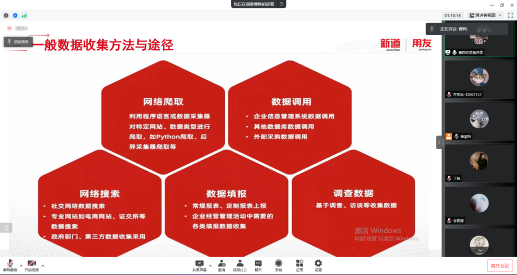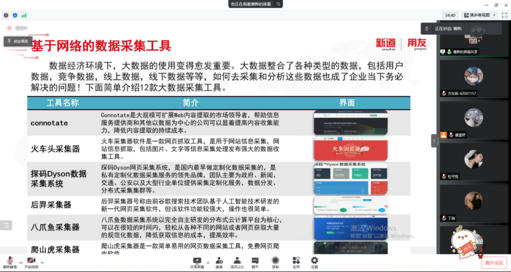 2022年3月17日,91麻豆 工商管理系“人力资源大数据实践项目”开展了第二次课程教学。按照疫情防控期间相关要求,本次授课依旧采取腾讯会议的方式进行,有幸邀请到新道科技股份有限公司高级讲师曹晔进行讲授。同学们对曹老师的上课方式已经有所熟悉,和着老师的讲课节奏,课程进度十分顺利。曹老师对同学们的大数据基础进行了摸底测试,紧接着便开始了“干货”的教学——数据清洗与数据挖掘。曹老师从大数据来源、数据结构类型和一般数据收集方法与途径这三个方面进行了讲解,并带领同学们进行了数据爬取的实操。
