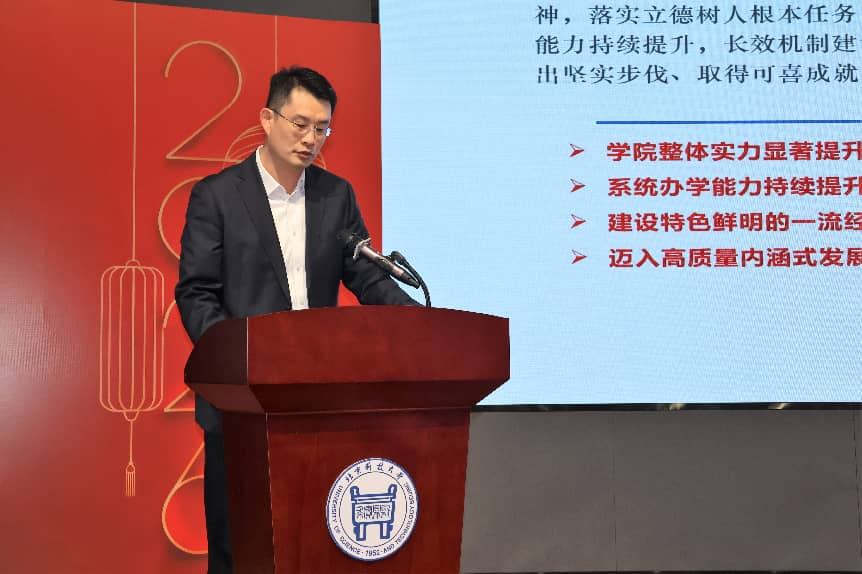 院长谷炜代表学院领导班子作2025年学院工作报告。学院以党建为统领,在教育教学、科研创新、师资引育、社会服务、学生成长同步发力,交出了一份厚重与质量齐升的答卷。随后,院长谷炜做学院十五五事业发展规划。2026年是十五五元年,更是学院跃升突破的关键窗口期。牢记习近平总书记给学校师生两封重要回信嘱托,以开局即决战、起步即冲刺的奋进姿态,锚定十五五,绘就2035远景蓝图,凝心聚力、勇毅前行,奋力谱写特色鲜明一流经管学院新篇章!