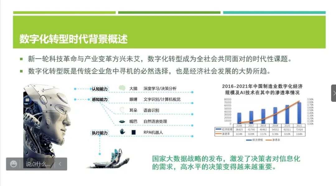 田芯老师首先从数字化时代转型背景出发,对国家大数据战略发布与社会经济发展趋势做了相关介绍。田老师指出,系统化、数据化管理已成为管理数字化转型的重要趋势。2020年8月国务院国资委发布《关于加快推进国有企业数字化转型工作的通知》,在此背景下,打通业务流、数据流、控制流已成为保护国有资产安全、业务安全、交易安全的重要抓手,国资国企在线监督平台由“业务数字化”走向“数字业务化”,以挖掘数据金库实现优化提升。