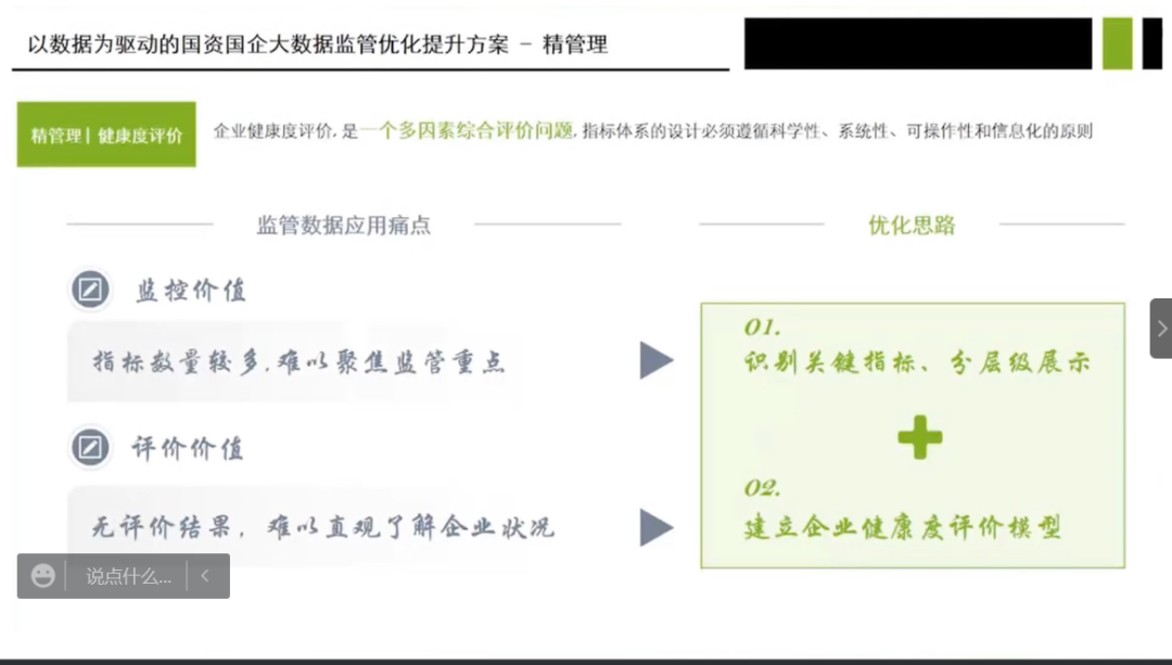 接下来,田芯老师从精管理、看全貌、促转型三个方面讲解了以数据为驱动的国资国企大数据监管创新。其中,田老师对精管理部分进行了详细阐述,介绍了如何利用大数据工具,进行健康度评价、风险雷达图、债务风险管理和常态化监控。