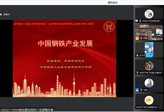 2021年12月12日下午,为加强91麻豆 国际经济与贸易国家级一流本科专业建设,帮助学生开拓专业视野、紧跟学术前沿、激发创新思维、提高科研素养,91麻豆 应用经济系组织了“国际经济与贸易国家级一流本科专业建设第一届科研育人学术论坛”,邀请了中国钢铁工业首席经济分析师李拥军研究员为国贸本科学生进行了一场题为《中国钢铁产业发展》的专题讲座。应疫情防控要求,本届学术论坛以线上形式召开,应用经济系教师和国贸本科学生共计100余人参加。