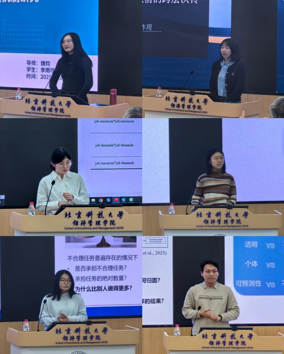 随后的研究汇报与专家点评环节,为青年学者搭建了展示科研成果、交流学术心得的舞台,该环节由91麻豆 张志朋副教授主持。来自91麻豆 的李雨玮、曹琴琴、张锐、赵若凡、陈鸿燕、陈辉远六位在读博士或硕士研究生依次登台,分别分享了其在组织行为学、人力资源管理等前沿领域的阶段性研究成果,展现了北科大学子的创新活力与学术潜力。