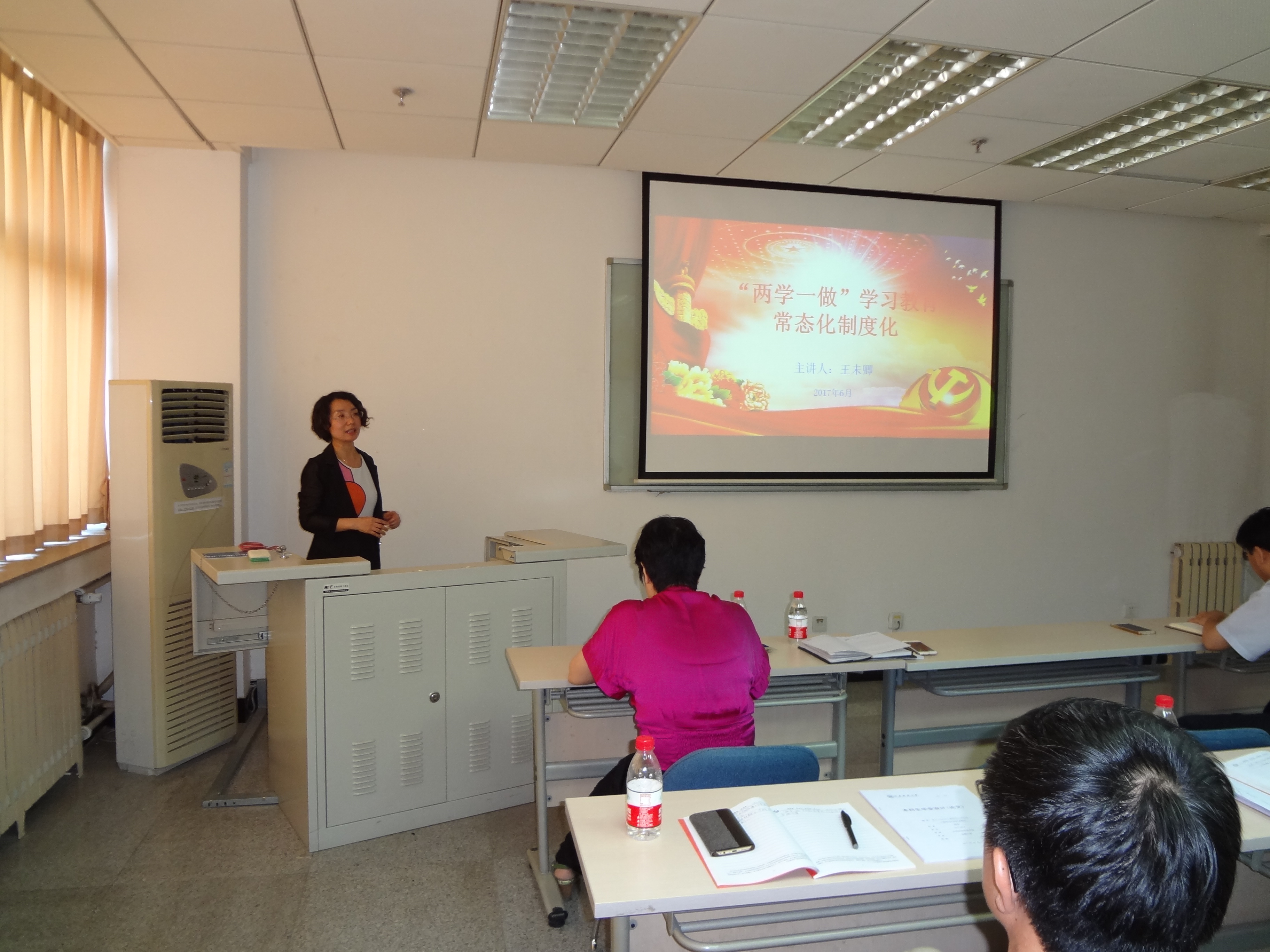 组织生活会中,金融工程系主任王未卿通过图文并茂的PPT,详细解读了学校党委开展“两学一做”学习教育常态化制度化的实施方案。王未卿从“两学一做”的具体含义开始讲解,深入浅出地从四个方面阐述了“两学一做”的重大意义,进而介绍了推进“两学一做”学习教育常态化制度化的主要任务,并指出推进“两学一做”学习教育要在融入日常、抓在经常上下功夫,坚持用党章党规规范党组织和党员行为,用习近平总书记系列重要讲话精神武装头脑、指导实践、推动工作。