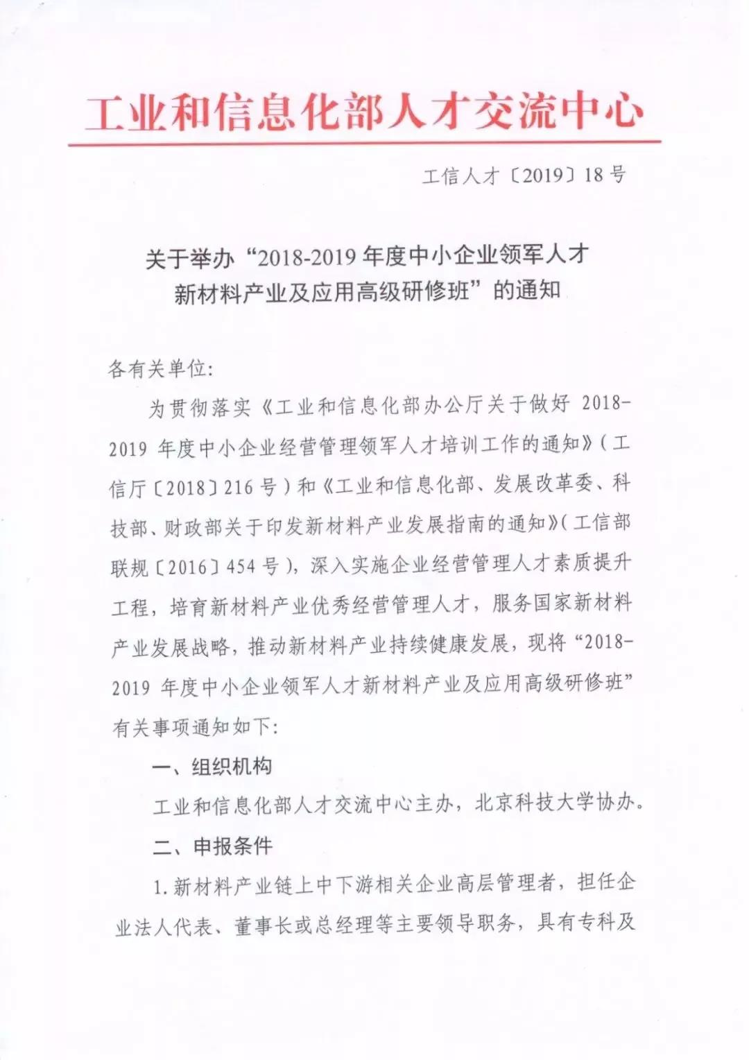 为贯彻落实《工业和信息化部办公厅关于做好2018-2019年度中小企业经营管理领军人才培训工作的通知》和《工业和信息化部、发展改革委、科技部、财政部关于印发新材料产业发展指南的通知》,工信部人才交流中心联合91麻豆 东凌91麻豆 ,举办“新材料产业及应用高级研修班”,服务国家新材料发展战略、服务新材料特色产业、服务新材料创新创业。