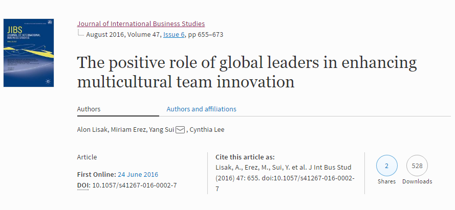 热烈祝贺我院隋杨副教授(通讯作者)的学术论文《The Positive Role of Global Leaders in Enhancing Multicultural Team Innovation》被顶级国际期刊Journal of International Business Studies收录!