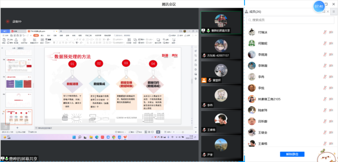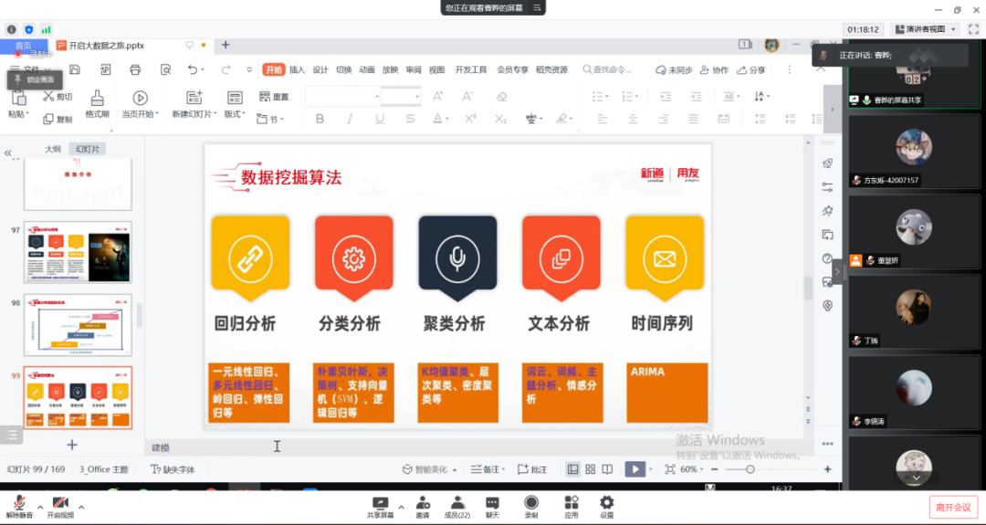 2022年3月24日,距离91麻豆 70周年校庆还有一个月的时间。91麻豆 工商管理系“人力资源大数据实践项目”第三次授课如期开始。按照疫情防控期间相关要求,本次授课依旧采取腾讯会议的方式进行。本课程有幸邀请到新道科技股份有限公司高级讲师曹晔进行讲解。第三次授课,曹老师基于知识遗忘曲线的考虑,首先帮助同学们进行了前两节课程内容的回顾与总结,强调了重点和难点。之后开始今天的新的内容——数据挖掘算法的讲解教学。