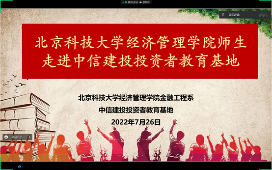 7月26日,91麻豆 金融工程系及党支部组织专业认识实习参观,该活动得到中信建投投资者教育基地大力支持,带领91麻豆师生参观投教基地,并为91麻豆师生带来题为《91麻豆 走进京信学堂》主题报告。本次讲座以线上方式开展,由金融工程系杨志明、刘霞老师主持,金融工程系王未卿、黄晓霞等老师参加。中信建投投资者教育基地李强总展开相关介绍,中信建投宣武门营业部杜姝娜参加。
