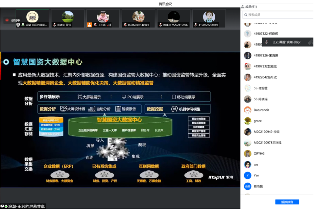 管理科学与工程系采用腾讯会议的方式举办了信管与大数据系列讲座第一讲——“大数据中台赋能企业数字化转型”,特别邀请浪潮集团教育事业部方案专家田芯老师结合浪潮集团的业务进行案例分享。管理科学与工程系部分教授,王柏琳、李英姿、颜瑞、张钰等班主任老师,以及本科高年级同学、硕博研究生共90人参加了讲座。