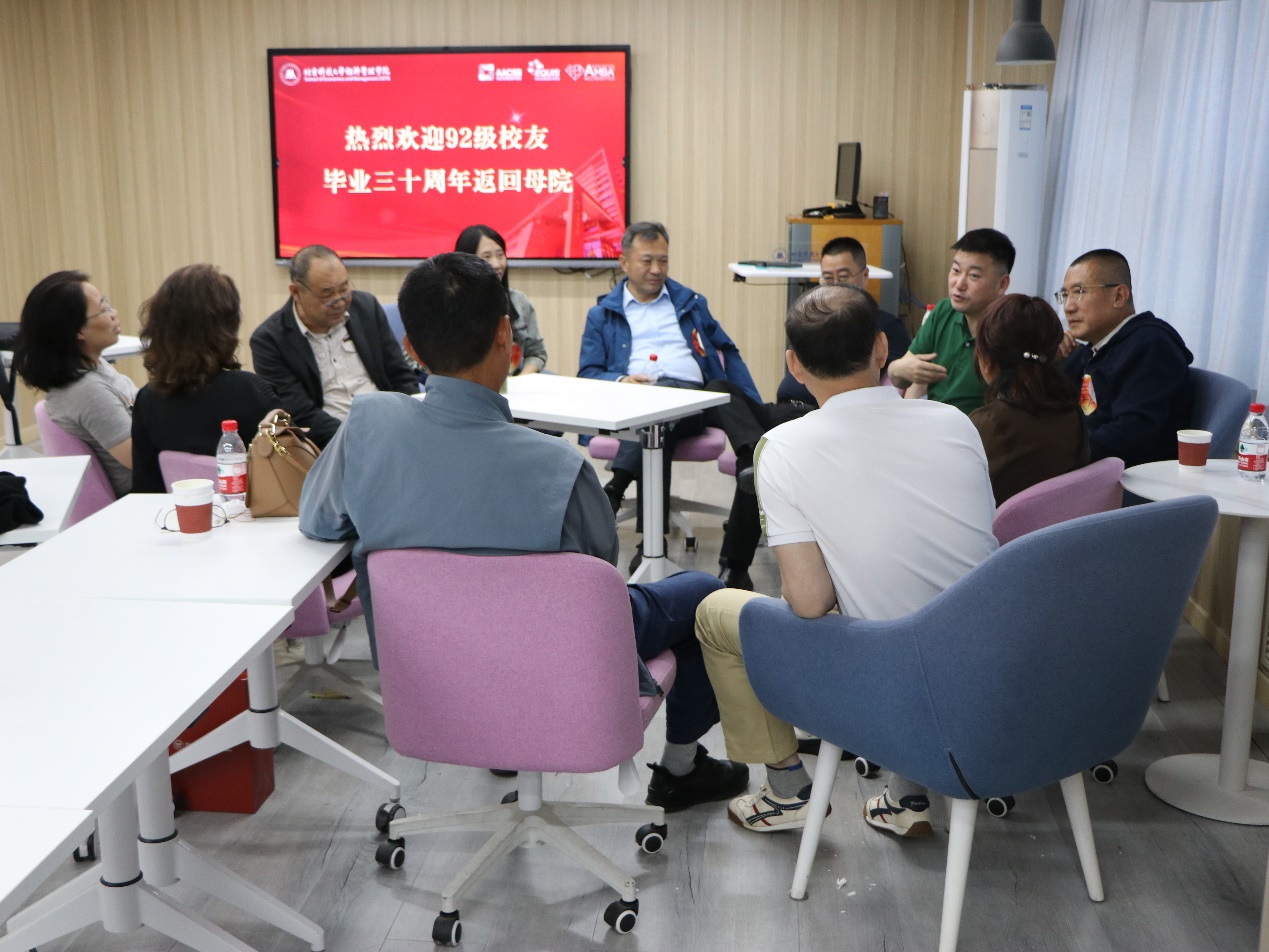 下午,学院精心准备,热情迎接96届校友重返母院,并开放了教室、实验室、经管课栈供大家参观交流,共同纪念毕业三十周年。阔别三十载,久别重逢,不少校友难掩激动,彼此相拥,互道一声“好久不见”。校友们围坐在一起,抚今追昔,从青葱岁月聊到鬓角微霜,分享了各自的奋斗与坚守。漫步经管楼中,看着学院的新变化,大家由衷感到骄傲和自豪。三十年的时光带走了青涩,却留下了最深厚的师生情、同窗谊。无论走多远,学院永远是心里最温暖的家。最后,大家在欢声笑语中合影留念,心仍紧紧连在一起,温暖如初。