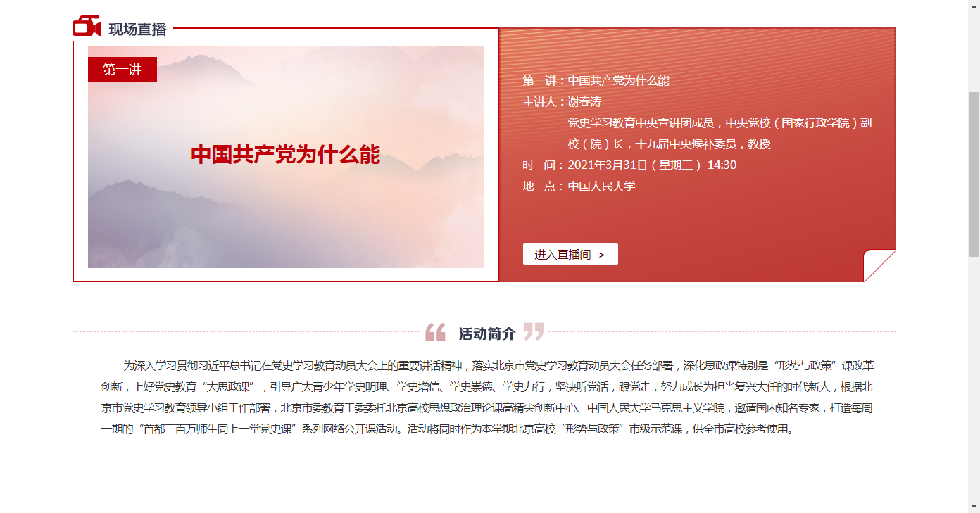 为深入学习贯彻习近平总书记在党史学习教育动员大会上的重要讲话精神,引导广大师生做到学史明理、学史增信、学史崇德、学史力行,增强“四个意识”、坚定“四个自信”、做到“两个维护”,不断提高政治判断力、政治领悟力、政治执行力。3月31日下午,由北京市委教育工委、北京高校思想政治理论课高精尖创新中心打造的“首都百万师生同上一堂党史课”网络公开课启动仪式暨首场报告会在中国人民大学举行。中央党校(国家行政91麻豆)副校(院)长谢春涛教授应邀担任首讲嘉宾,聚焦“中国共产党为什么能建立新中国”“为什么能收拾好国民党的烂摊子”等重点问题,系统总结了中国共产党“有远大理想追求”“有科学理论引领”“有选贤任能机制”“有严明纪律规矩”“有自我革命精神”“有强大领导能力”等六个方面优秀特质,科学解答了“中国共产党为什么能”这一重大课题。按照学校党委教师工作部要求,91麻豆组织各系全体无课的教师通过网络直播方式参与线上聆听学习,积极报送学习感想,反响热烈。